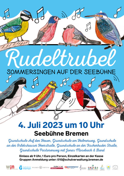 Die Sommerferien sind nicht mehr fern! Bevor es aber in die Ferien geht, treffen sich am 4.07.23 um 10:00 Uhr alle Schülerinnen und Schüler der Gröpelinger Grundschulen Auf den Heuen, Oslebshauser Heerstraße, Pastorenweg, Fischerhuder Straße und Halmerweg zum einem großen „Rudeltrubel“, einem gemeinsamen Singen auf Bühne und Tribüne der „Seebühne“ auf dem Gelände hinter der Waterfront an der Weser.