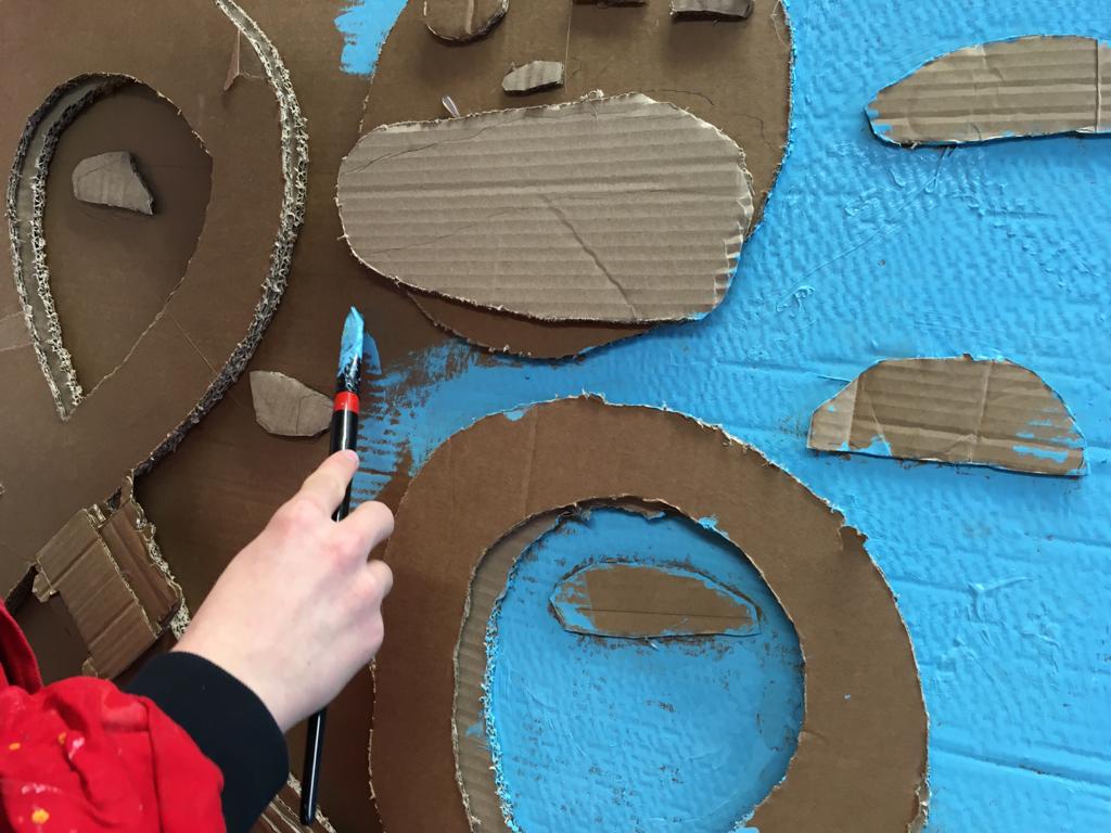 Diesmal besuchten Schüler*innen der Oberschule Ohlenhof u.a. die Ausstellung “Light and gravity“ von Andrea Bowers in der Weserburg – Museum für moderne Kunst. Die Künstlerin arbeitet verschiedenen Materialien und die Schüler*innen waren vor allem von den Bildern und Schriftzügen beeindruckt, die aus geklebter und bemalter Pappe erstellt wurden. Dieses Material wurde Ausgangspunkt für das Projekt. Einmal die Woche an sieben Terminen arbeiteten die Schüler*innen künstlerisch im Kinderatelier im Atelierhaus Roter Hahn.
