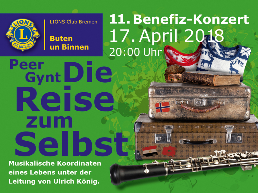 Das 11. Benefiz-Konzert begleitet Peer Gynt auf seinem Weg durch Zeit und Raum. Ulrich König und sein Ensemble transformieren die Suiten der Griegschen Pauschalreise in einen Abenteuertrip voller Überraschungen. Für alle, die ihr akustisches Navi schon jetzt vorprogrammieren wollen,