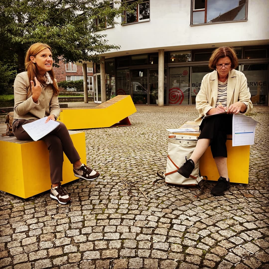 Beim Stadtspaziergang durch Gröpelingen spricht Senatorin Kristina Vogt (DIE LINKE) mit Jasmina Heritani, Projektleiterin der Aufsuchenden Bildungsberatung bei Kultur Vor Ort e.V. über die Arbeit vor Ort. Bis heute hat die Beratungsstelle im QBZ Morgenland über 860 Menschen in ihrer Bildungsplanung begleitet.