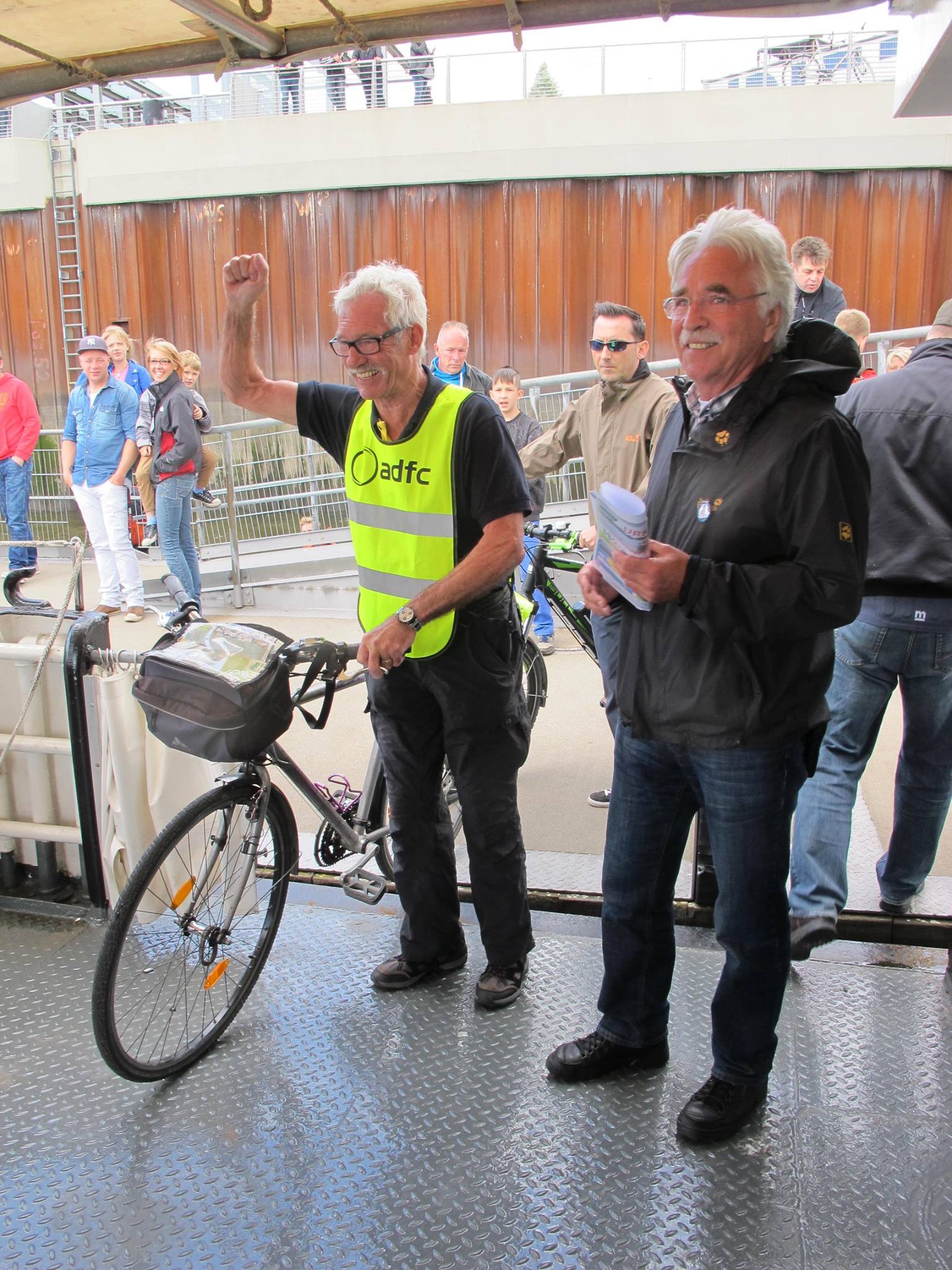 Gerhard Voll vom ADFC Delmenhorst hat am gestrigen Sonntag (22.6.) als 25.000. Fahrgast der Weserfähre zwischen Gröpelingen, Walle und Woltmershausen das Schiff betreten. Begrüßt wurde er von Dieter Stratmann (Hal Över), der neben dem Glückwunsch ein Jahresticket für zwei Personen auf allen Routen der Hal Över-Flotte bereit hielt. „Wir nutzen, von Delmenhorst aus kommend, die Weserverbindungen für Radtouren gern“ so Gerhard Voll, der mit 15 Radfahrern aus Delmenhorst gekommen war. „Allerdings sind wir erst vor Kurzem auf der Route zwischen Gröpelingen und Woltmershausen gestoßen“.