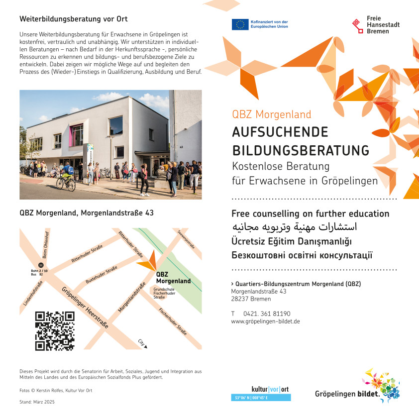- Die Aufsuchende Bildungsberatung in GröpelingenDie Aufsuchende Bildungsberatung richtet sich an erwachsene Gröpelinger:innen und behandelt Fragen zur schulischen und außerschulischen Weiterbildung, Nachqualifizierung, zu Deutschkursen, Praktika und Arbeitsplatzsuche. Sie ist eine…