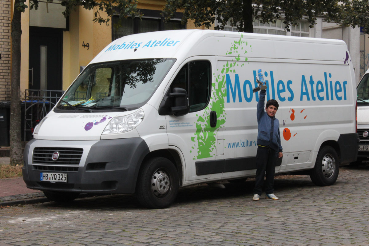 Ein großer Tisch wird aufgebaut, Staffeleien werden aus dem Bus geholt und die Malkittel ausgepackt – das Mobile Atelier verwandelt von April bis September Plätze im Quartier in eine temporäre Kunstwerkstatt unter freiem Himmel.