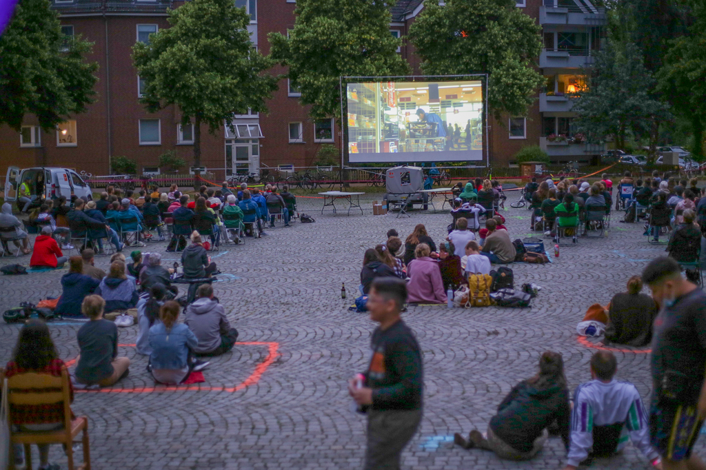 Am Freitag, den 2. Juli, hat das Reisende Freiluftkino Gröpelingen seine Premiere gefeiert. Insgesamt haben über 150 Menschen das Programm auf dem Bürgermeister-Ehlers-Platz verfolgt. Die live produzierten lo-fi Klänge von Sambolek (Pseudonym von Musiker und Künstler Luca Diebold) haben den Abend eingeläutet. Dem folgten der lokal produzierte Kurzfilm „Das stört mich!“ (Bremen 2021, 6 Minuten) von vier Schüler*innen der Gesamtschule West, die dem Ruf von Gröpelingen innerhalb des Stadtteils auf den Grund gingen, gefolgt von dem Spielfilm ‚Shoplifters‘ (Japan 2018), der mit einnehmenden Bildern und einer Geschichte nach wahren Begebenheiten die Zuschauer*innen bannte.