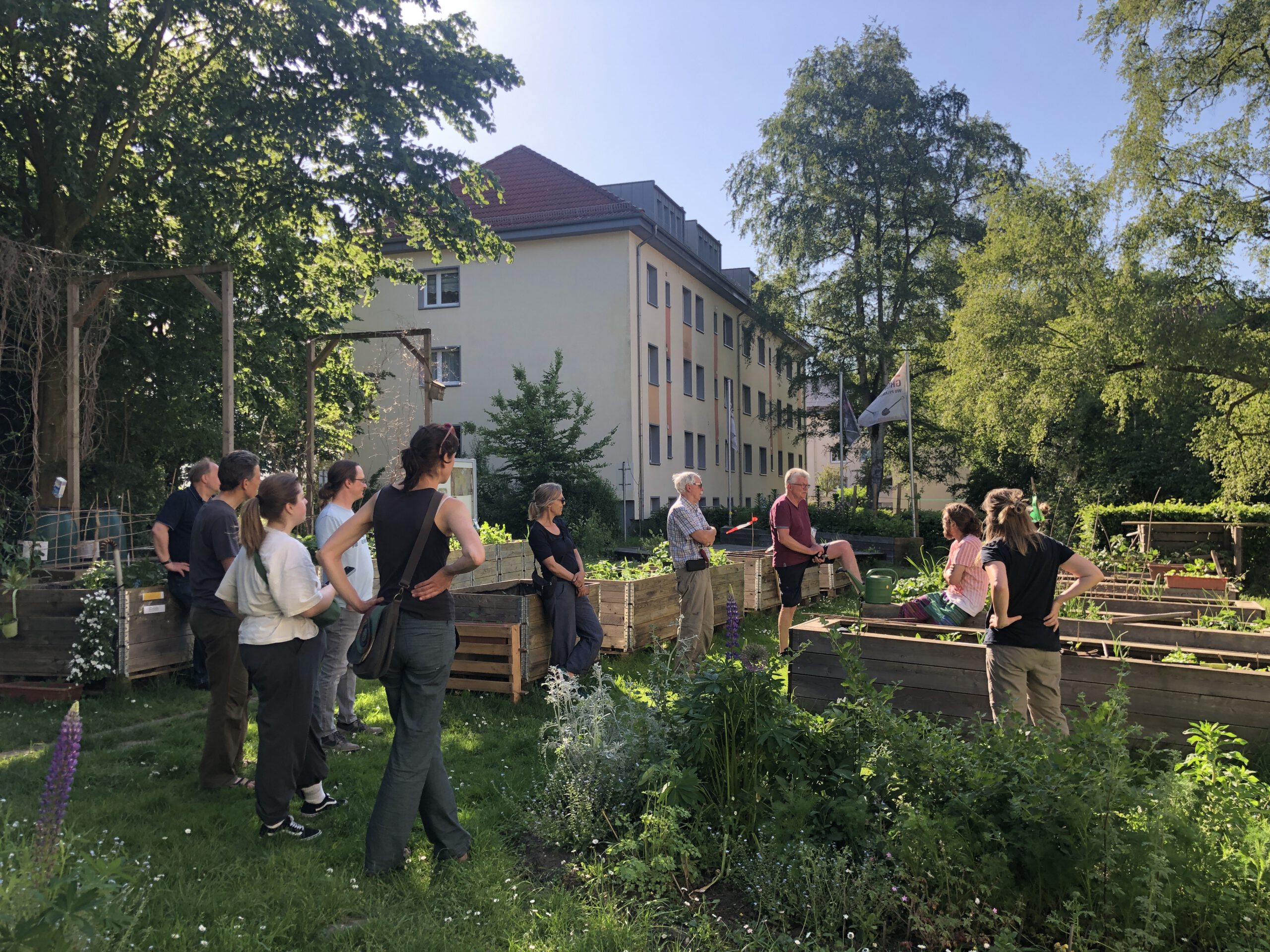 Direkt um die Ecke befindet sich das GRÖPILAND, ein von Nachbarn geschaffener Gemeinschaftsgarten. Ein Paradies umgeben von Wohnhäusern, wo fleißig gemeinsam Gemüse und Blumen gepflanzt und gepflegt werden. Weiter ging es zum Ringelblumenweg. Dort entsteht ein Gemeinschaftsgarten mit Gewächshäusern, Hochbeeten, einem Brunnen und einer Laube für verschiedenste Projekte in der Zukunft – über Kochkurse bis hin zu Naturlernpfad.