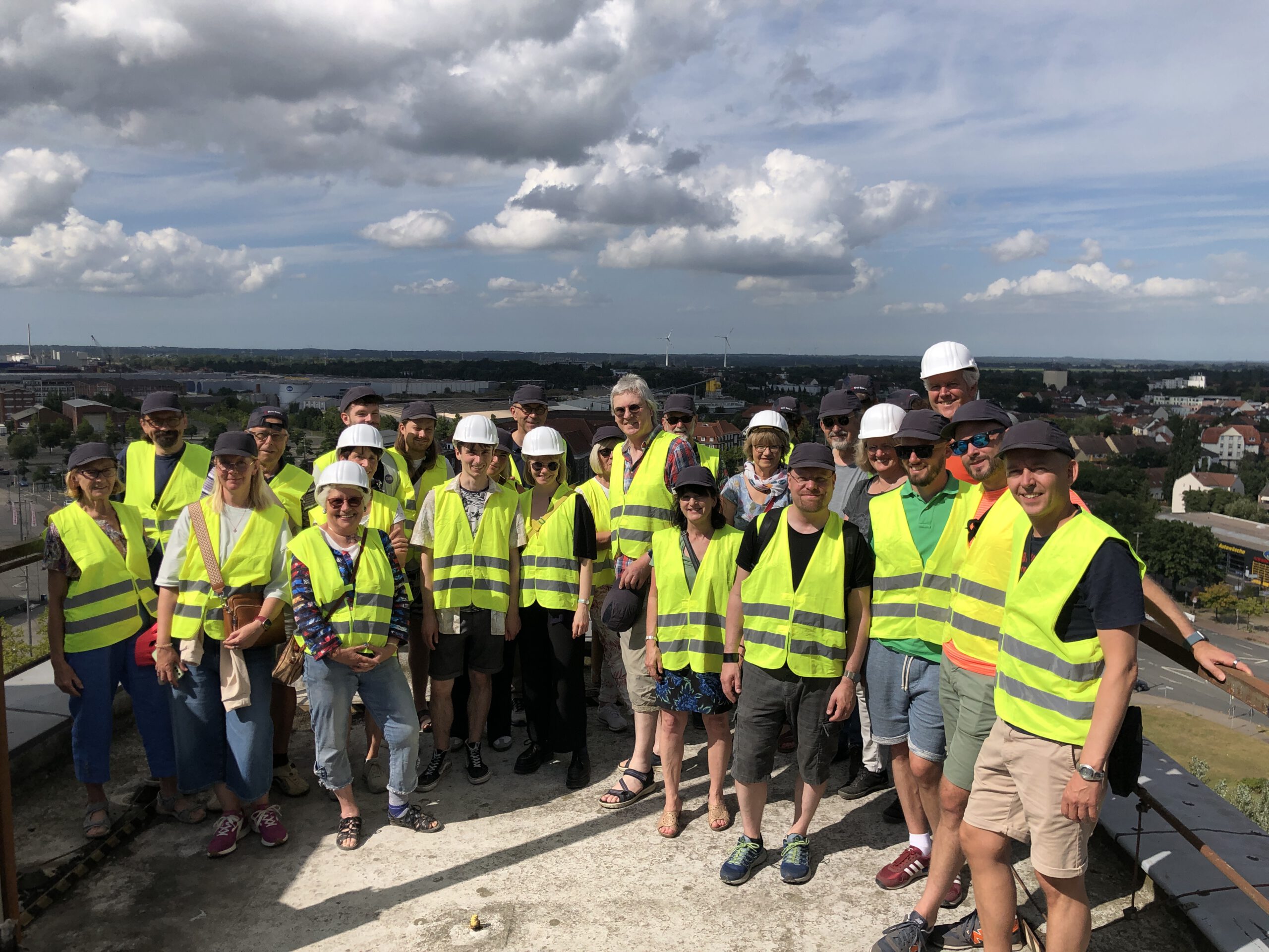 Wir erklimmen die alten Steintreppen bis zu dem Aussichtpunkt am Ende des Silo 2. Dort entfaltet sich ein einzigartiger Ausblick über den Bremer Westen bis Worpswede und über die gen Norden schlängelnde Weser bis in die verschiedenen Bremer Häfen. Vor dieser Aussicht bekommen die Teilnehmer:innen eine Einführung in die Stadtteilentwicklung rund um den Koloss und wie sich das Gelände drumherum im Laufe der Zeit verändert hat.