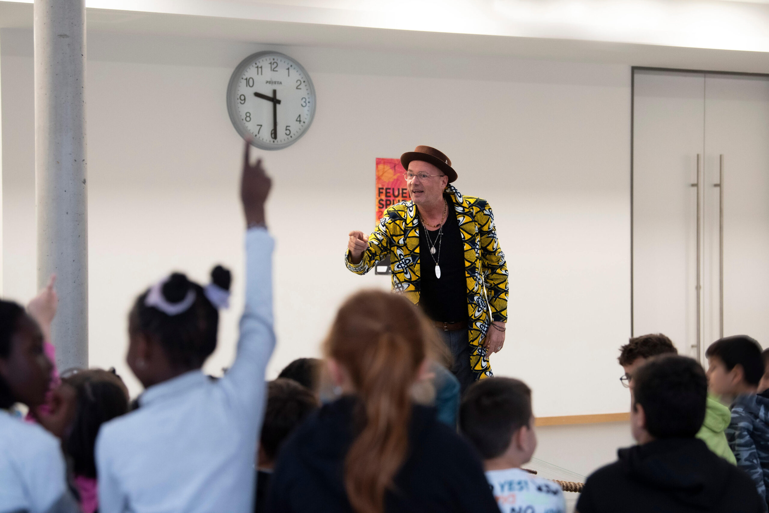 Kinder aus dem ersten und dem zweiten Jahrgang der Grundschule am Pastorenweg sowie dem benachbarten Kinder- und Familienzentrum Pastorenweg lauschten Tormenta Jobarteh, der die Geschichte vom unerschrockenen König und der verletzten Löwin erzählte, die dem König aus Dankbarkeit ein Geschenk machte. Über die Kraft der Freundschaft ging es bei der Geschichte über das Mädchen, dass die Tante an den Teufel verkaufen will. Klatschend und singend helfen die Kinder dabei mit, das Mädchen zu retten. „In Afrika sagt man Jo, wenn man zufrieden ist. Seid ihr zufrieden?“ „Joooo“ rufen alle.