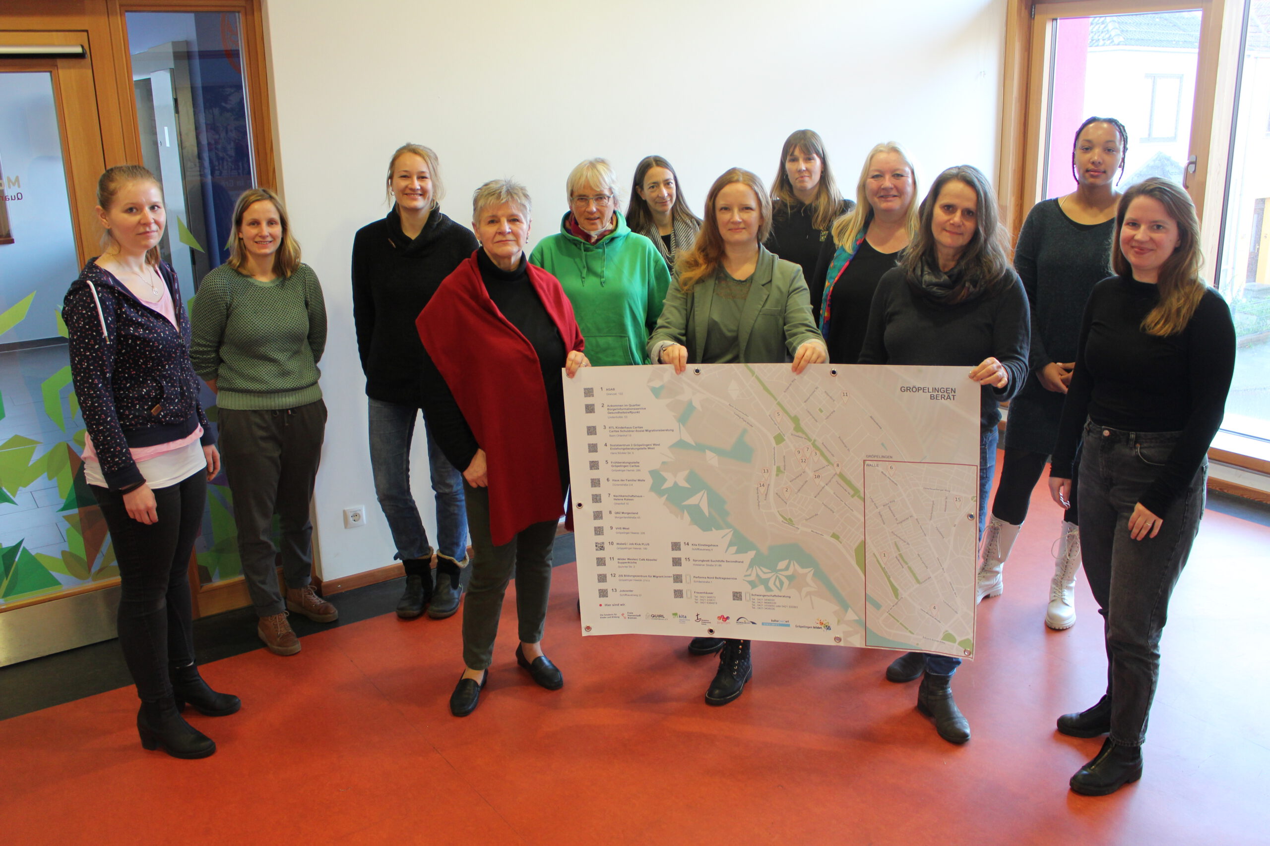 Im „Netzwerk Elternzusammenarbeit in der Kita“ herrscht kurz vor den Weihnachtsferien gute Laune: Die Sozialpädagoginnen aus den Gröpelinger Kinder- und Familienzentren halten ihre neuen Netzwerk-Karten in der Hand. Dieser Stadtplan zeigt die wichtigsten Beratungs- und Anlaufstellen für Familien in Gröpelingen: VHS, Nachbarschaftshaus Helene Kaisen, Frühberatungsstelle der Caritas und viele mehr. Ein dicker roter Punkt markiert jeweils den Standort der eigenen Kita: „Hier sind wir“. Mit dieser Karte kann in Elterngesprächen ab jetzt viel leichter aufgezeigt werden, wo Mütter, Väter und andere erwachsene Bezugspersonen von Kindergarten-Kindern weitere Unterstützung finden.