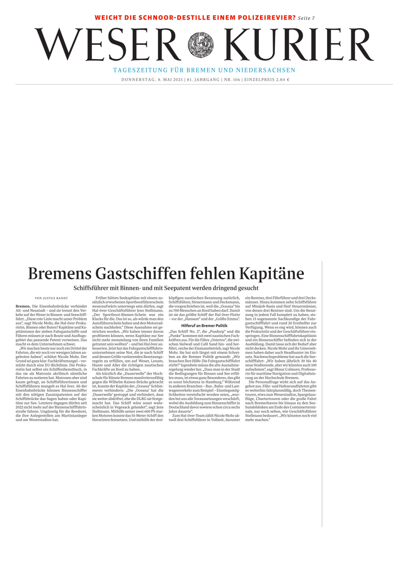 Die personell knappe Situation habe mit Fachkräftemangel aber insbesondere auch mit den unterschiedlichen Patenten für Binnen- und Seeschifffahrt nach der EU-Richtlinie zu tun. Den gesamten Artikel gibt es hier als PDF oder beim Weser Kurier nachzulesen: