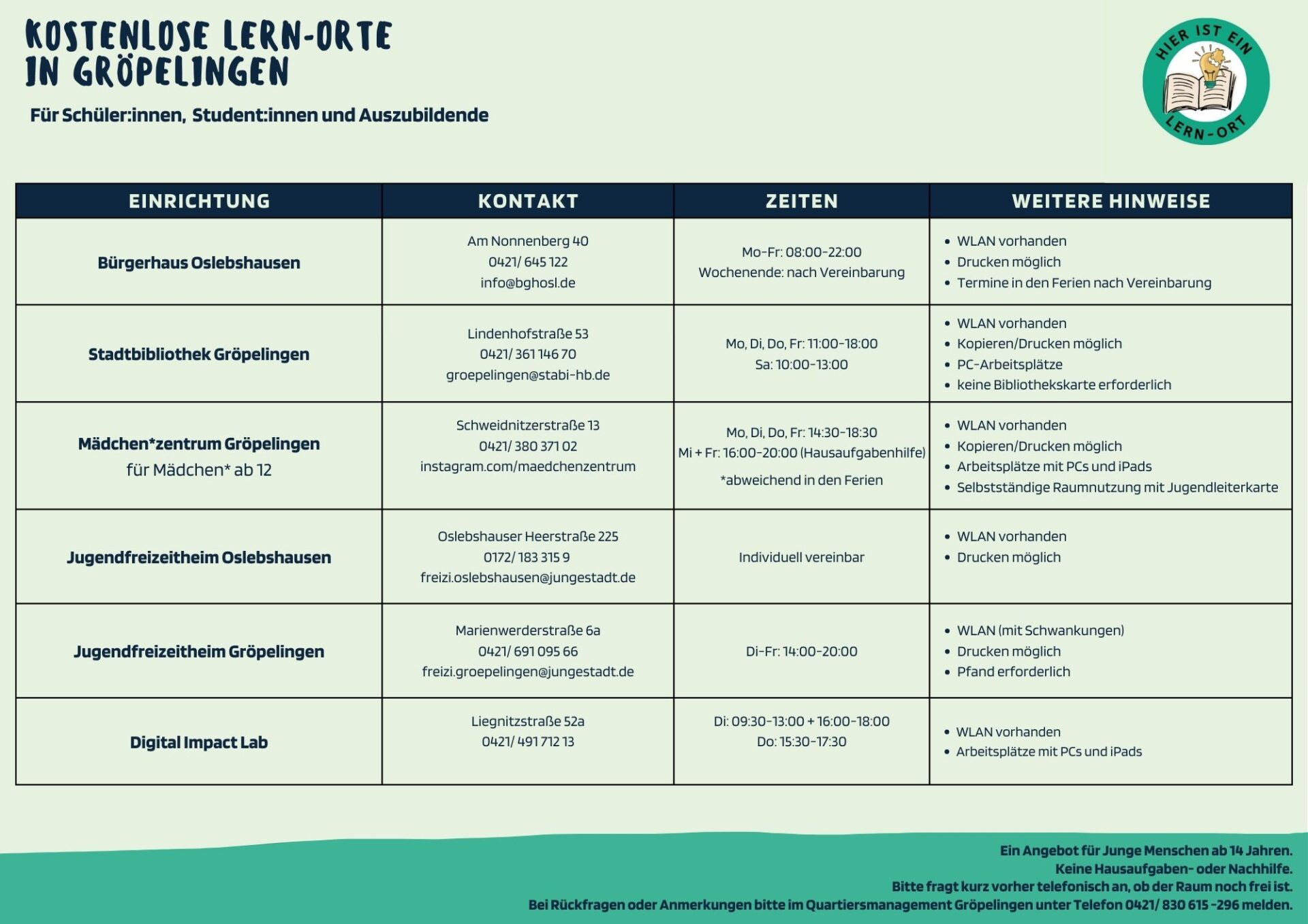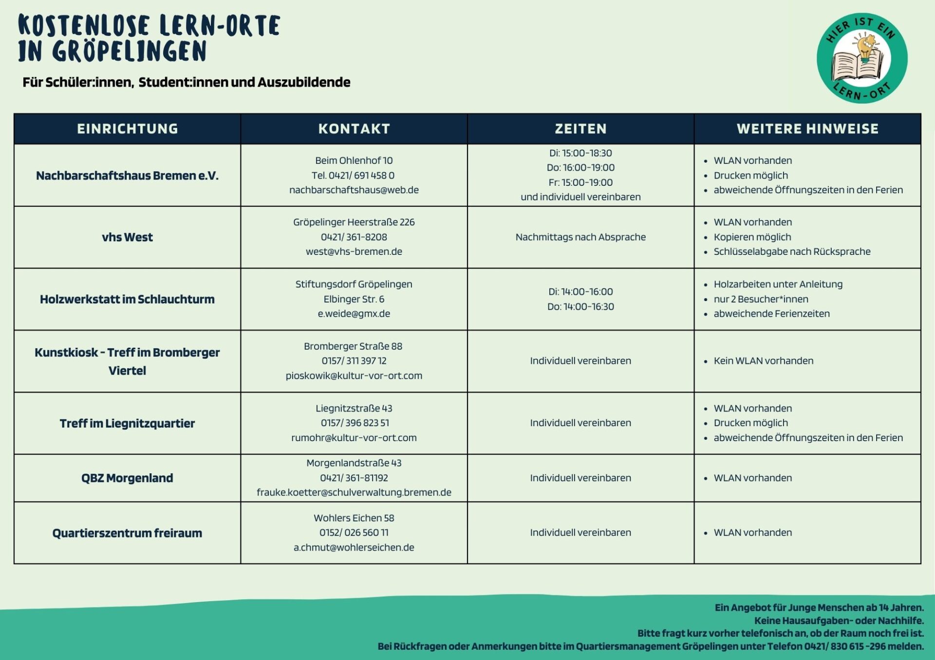 Dir fehlt zu Hause die Ruhe zum Lernen? Dann besuche unsere kostenlosen Lernorte in Gröpelingen! In der Übersichtsliste sind alle teilnehmenden Einrichtungen aufgeführt sowie wichtige Informationen.