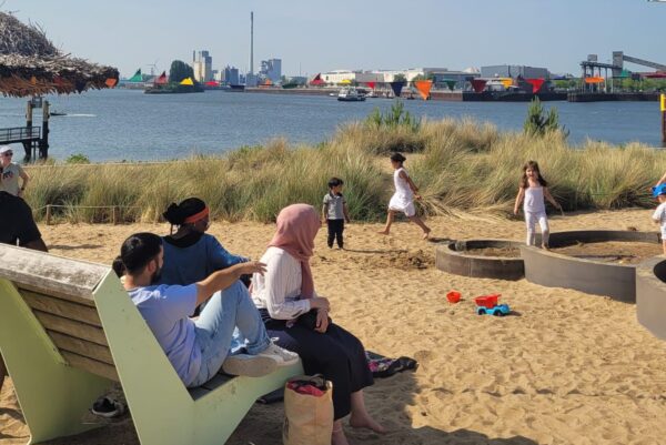 Ein Junge steht im Vordergrund und pustet Seifenblasen. Im Hintergrund ist ein Gebäude mit dem Schild „Kunstkiosk“ zu sehen. Zwei pinke Pavillons stehen auf dem Gehweg, darunter sind mehrere Menschen im Gespräch.