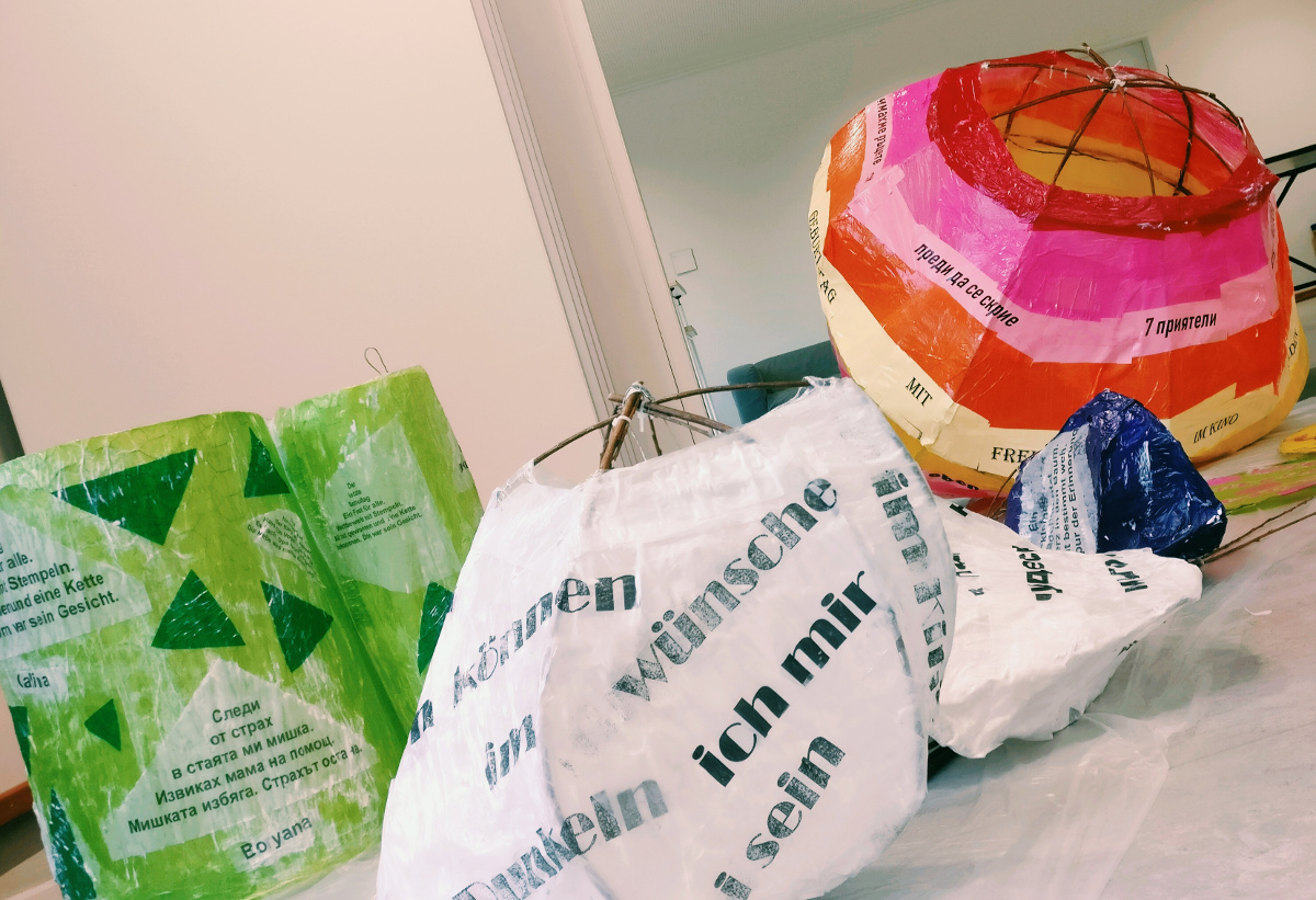Für eine große Kugel schrieben wir endlose runde Texte, die wir auf der Kugel druckten. Unser Thema war „Geschenkte Momente“ – zum Thema der Feuerspuren 2020 – und die Texte sind endlos, weil man bei jedem Wort anfangen kann und sie immer einen Sinn ergeben.