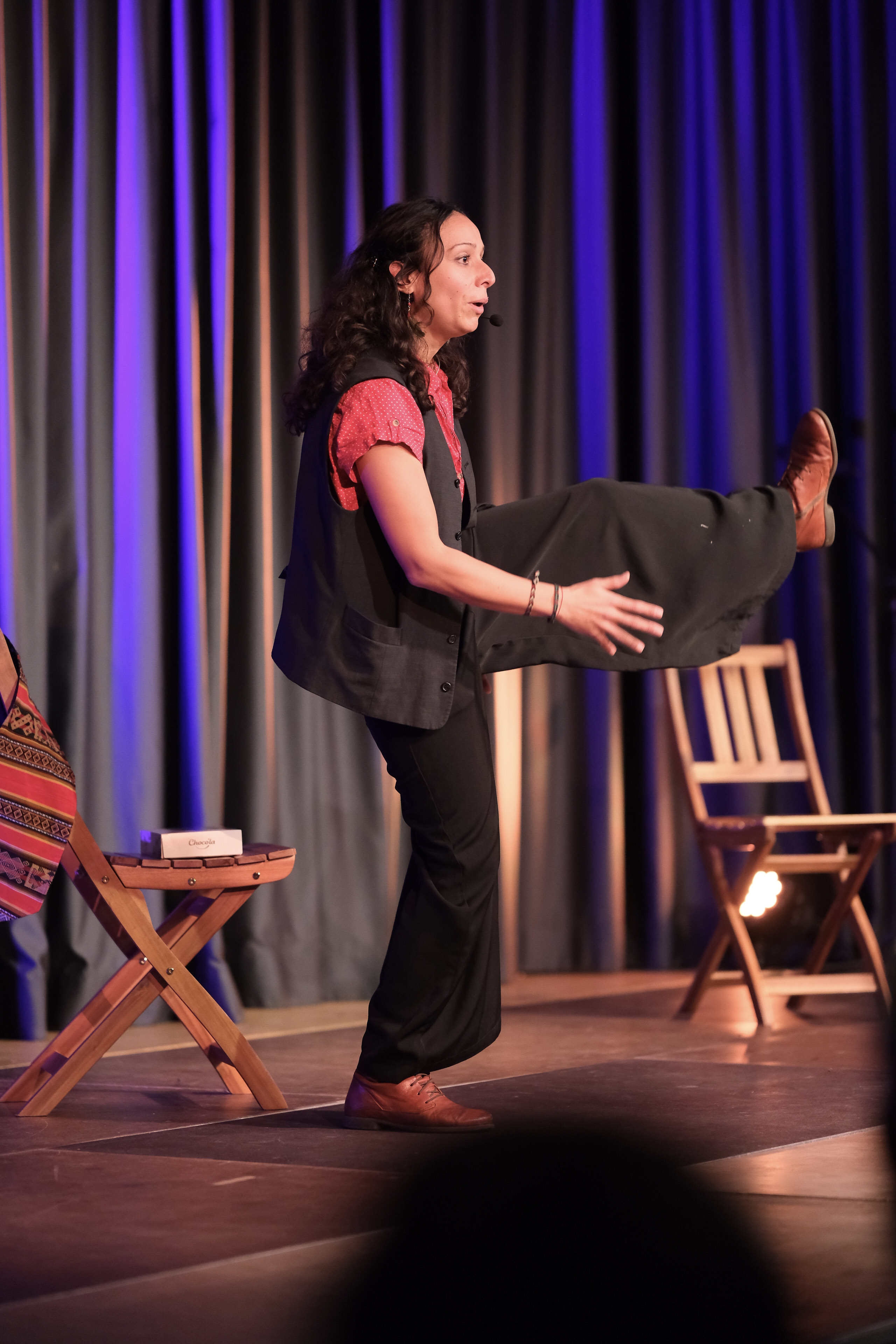 Von mangelnder Standfestigkeit gleitet Johanna Wollin über zu dem Gefühl, zwischen den Stühlen zu sitzen. Auf verschiedenen Erzählebenen präsentiert sie im virtuosen Wechsel zwischen Deutsch und Spanisch einen Mix aus traditioneller Erzählung und eigener Erfahrung. Welchen Migrationshintergrund hat man, wenn Papa aus Bremerhaven und Mama aus Peru/Italien stammt? Herkunftsstatus? Es ist kompliziert. Ausgrenzung? Garantiert: „Ich hatte halt bei uns auf dem Schulhof die dunkelste Hautfarbe.“ Die klebrige Süße der im Publikum verteilten Schokoküsse erinnern sie immer daran, wie es anfühlt, nicht zur Mehrheitsgesellschaft zu gehören.