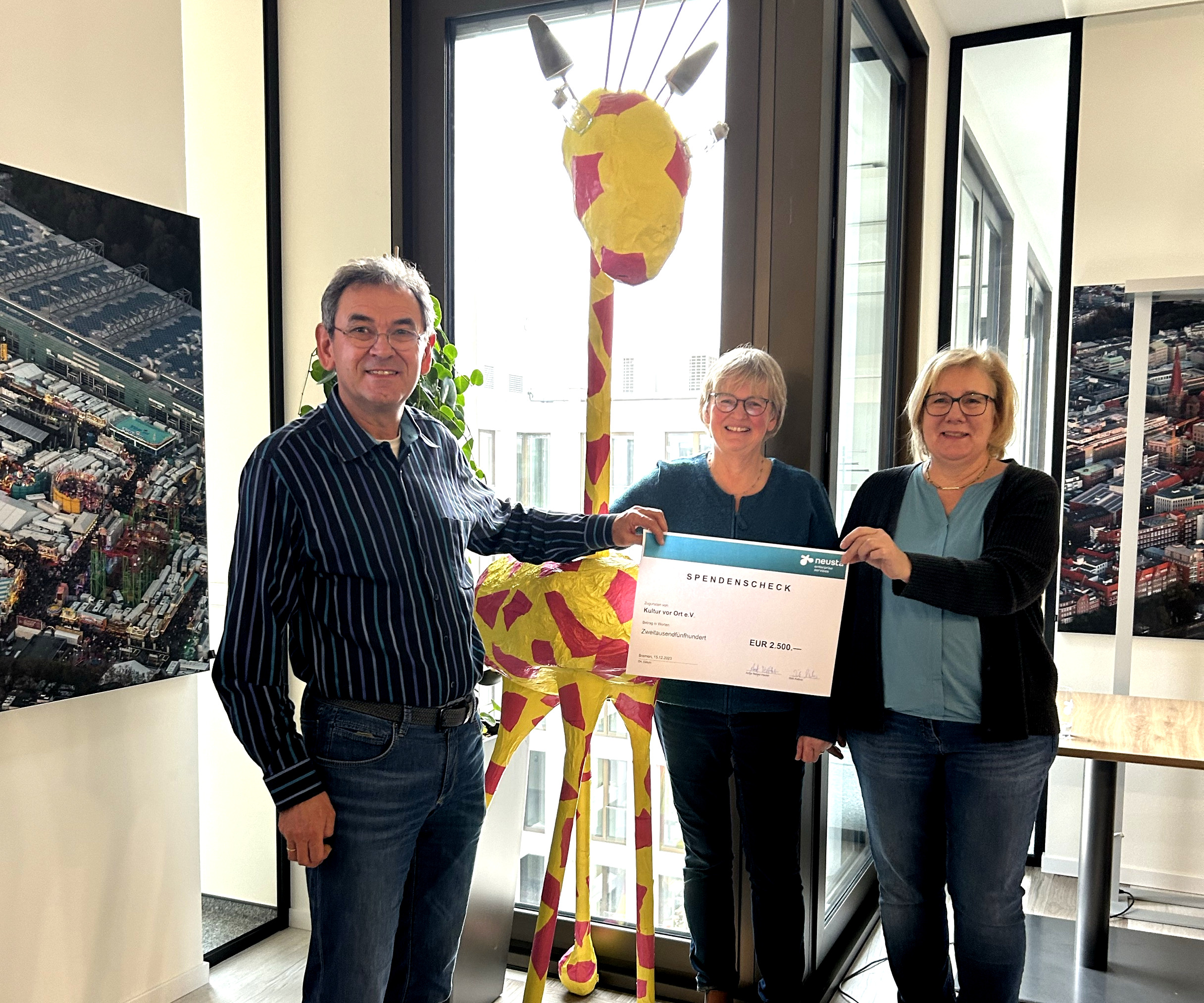 Die Spendenübergabe wurde begleitet von einem Überraschungsgast: Die gelbe Giraffe aus dem Kinder- und Jugendatelier hat den Weg aus Gröpelingen in den Firmensitz von Neusta Enterprise Services gefunden und ist nun als Dauergast bei den Spendern.