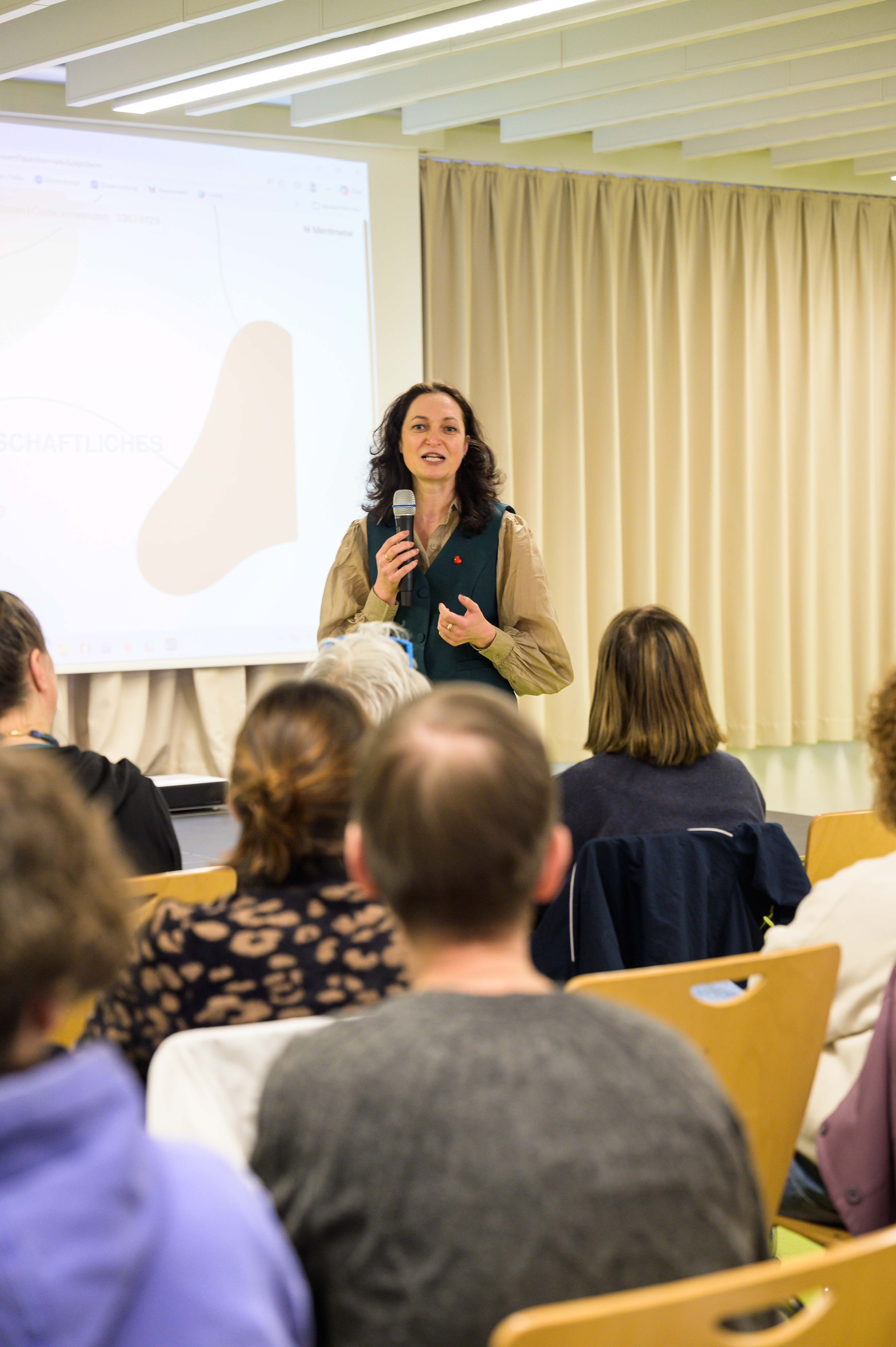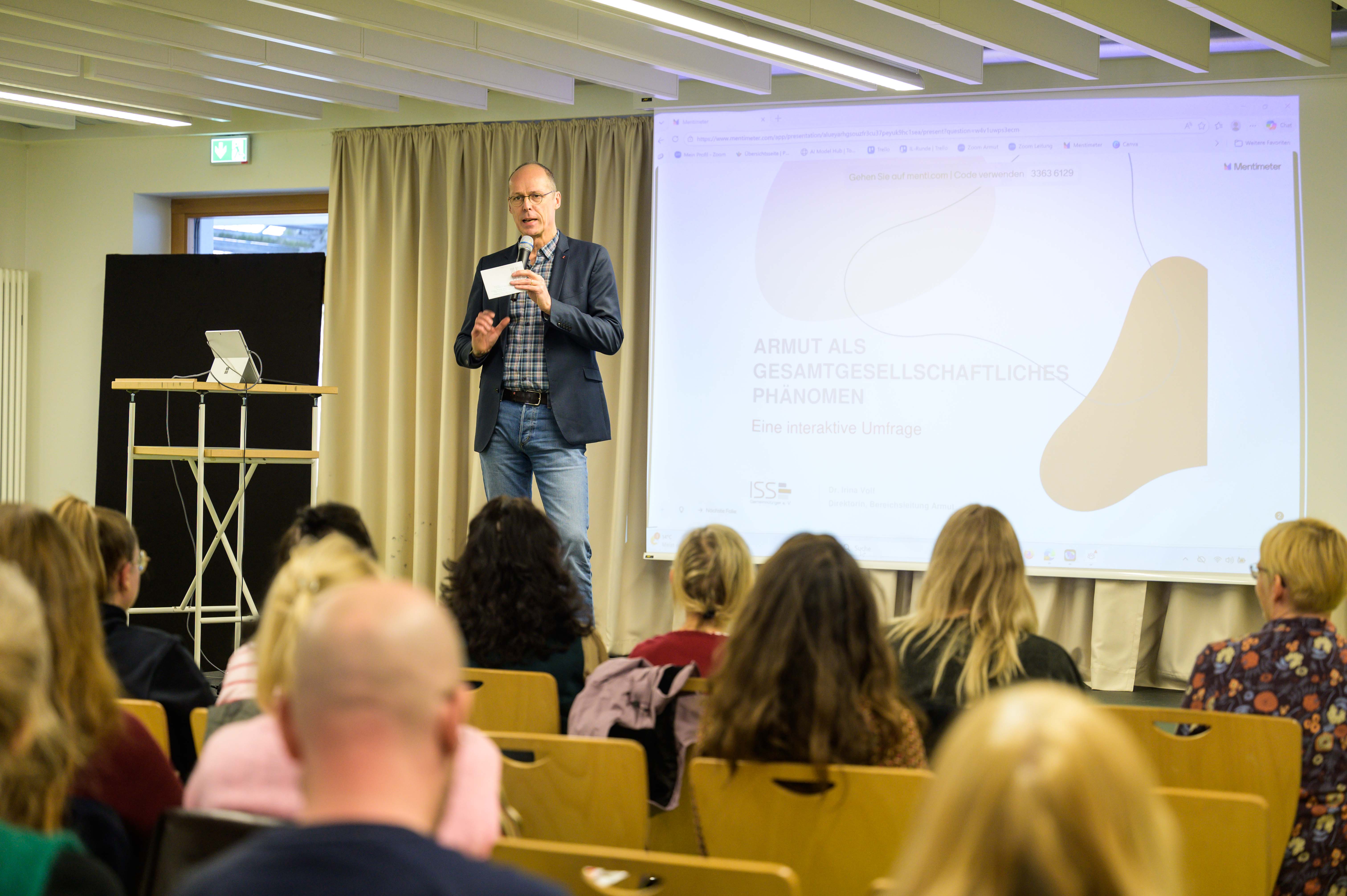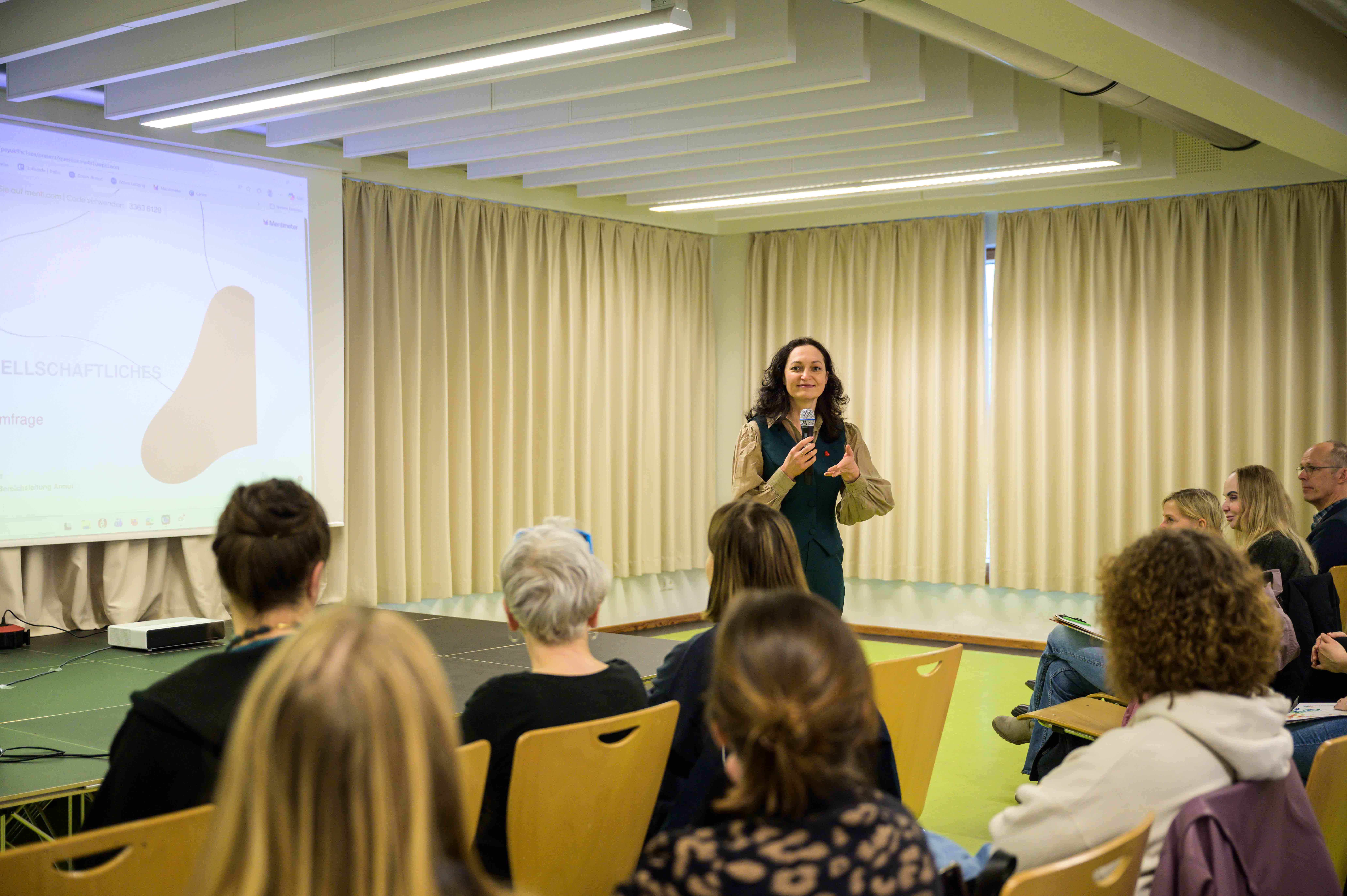 Bei Ihrem Vortrag bezog sie die Teilnehmenden über eine Mentimeter-Umfrage immer wieder in den Vortrag ein, indem sie nach Einschätzungen und Assoziationen zu Begriffen und den Zahlen der verschiedenen Armutsstatistiken fragte und die Ergebnisse mit Fakten abglich. So war es für viele Teilnehmenden überraschend, dass die ärmste Altersgruppe in Deutschland mit 25 % die 18–25-Jährigen sind und nicht wie in den Einschätzungen der Teilnehmenden, die ganz Jungen und ganz Alten.