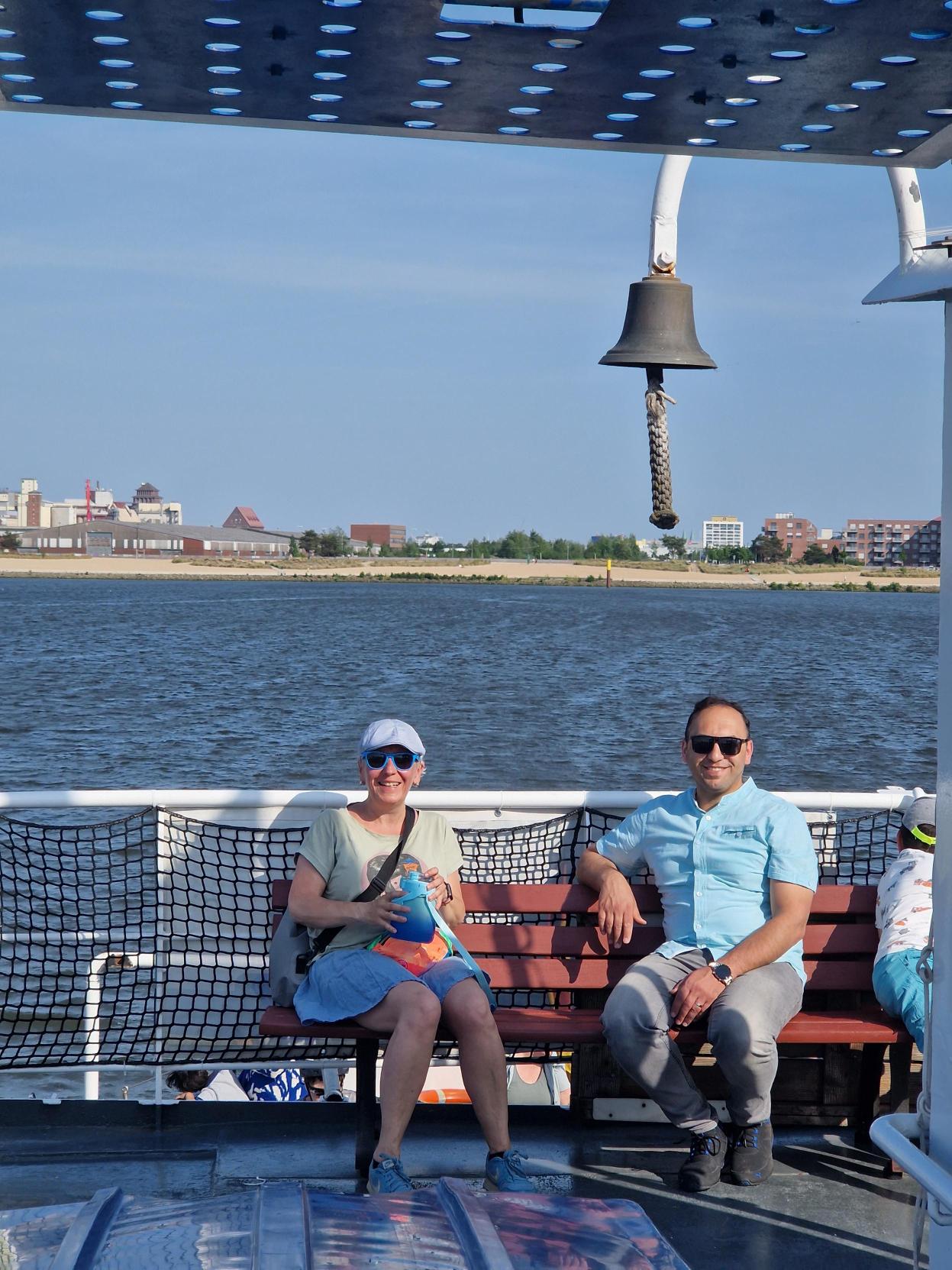 Zwei Personen mit Sonnenbrillen sitzen auf einer Bank auf einer Fähre. Im Hintergrund sind Wasser und ein Sandstrand zu sehen.