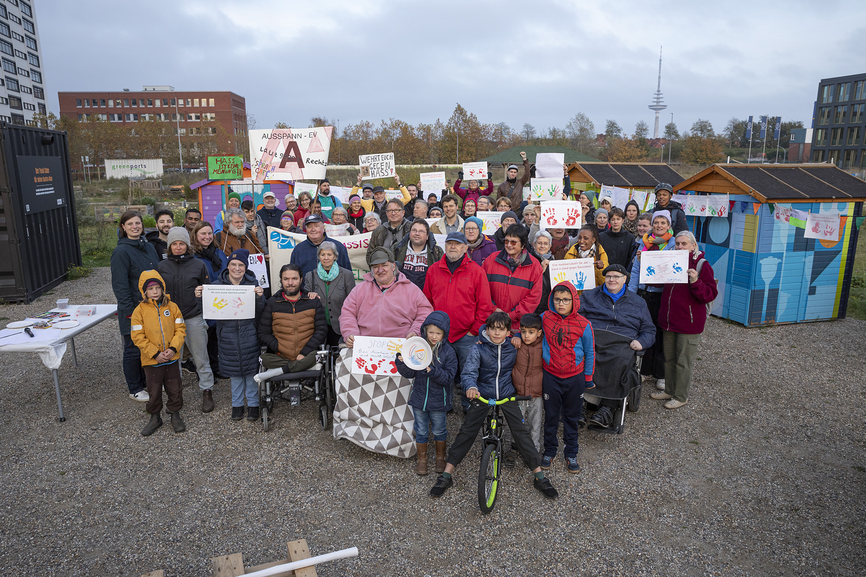Auf der Überseewiese setzten die Teilnehmenden mit bunten Handabdrücken auf großen Papieren ein symbolisches Zeichen für eine lebendige, solidarische Nachbarschaft. Die Handabdrücke stehen für Vielfalt und Zusammenhalt, für Akzeptanz und Offenheit. Ein großes Gruppenfoto mit allen gestalteten Botschaften wurde als Abschluss gemacht. Das Foto ist Titelbild unseres Solidaritätsbriefs und soll zeigen: Rassismus und Hetze haben hier keinen Platz! Die Unterstützung der Anwesenden zeigt, wie wichtig es ist, solche Vorfälle nicht stillschweigend hinzunehmen, sondern gemeinsam für eine offene und respektvolle Gesellschaft einzustehen. Die Überseestadt steht zusammen – und bleibt im Gespräch über Rassismus und Diskriminierung.