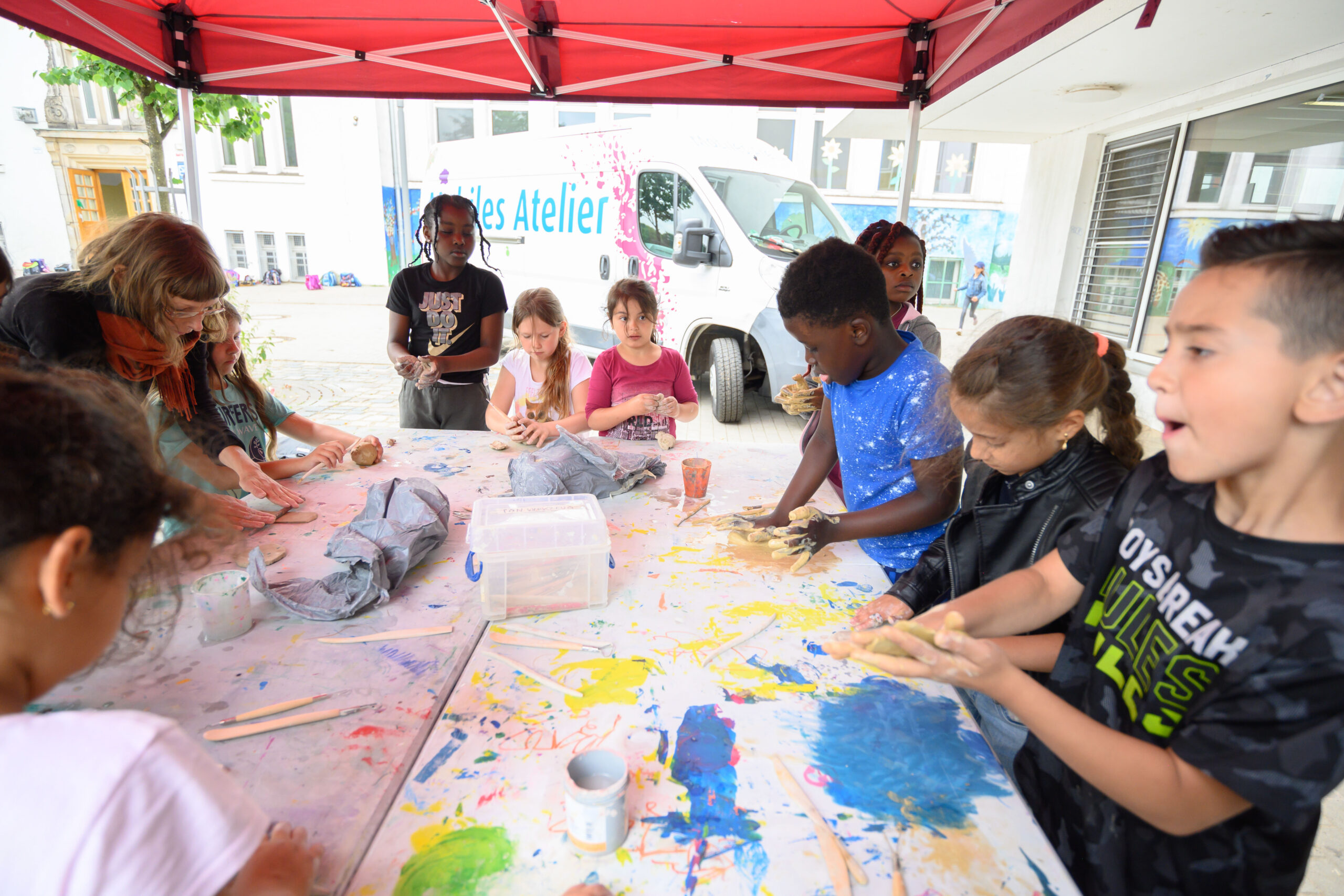 Das Mobile Atelier kommt in den Sommerferien an fünf Standorte in Gröpelingen und ist ein fester Bestandteil des nachbarschaftlichen Lebens in den Quartieren. Kinder, Jugendliche, Eltern und Großeltern sind eingeladen, sich künstlerisch zu betätigen. In der Rostocker Straße, im Kunstkiosk in der Bromberger Straße, auf dem Greifswalder Platz, Liegnitzplatz und auf dem Bibliotheksplatz entsteht für Kinder ab sechs Jahren unter freiem Himmel eine kostenlose künstlerische Werkstatt.