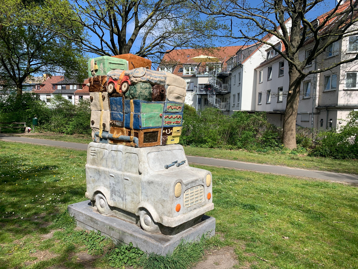Hatice Turan kommt oft an der kleinen Skulptur, dem FORD TRANSIT im Grünzug West /Höhe Halmerweg vorbei. Heute kann sie nur schmunzeln, wenn sie den Ford Transit sieht. „Er weckt Erinnerungen an eine Zeit, die schon eine Ewigkeit her, aber dennoch nicht vorüber ist. Meine bulgarischen Nachbarinnen erleben heute das Gleiche, sie kaufen schon im Sommerschlussverkauf des Vorjahres Badelatschen und T-Shirts als Mitbringsel für den kommenden Sommer am Schwarzen Meer.“