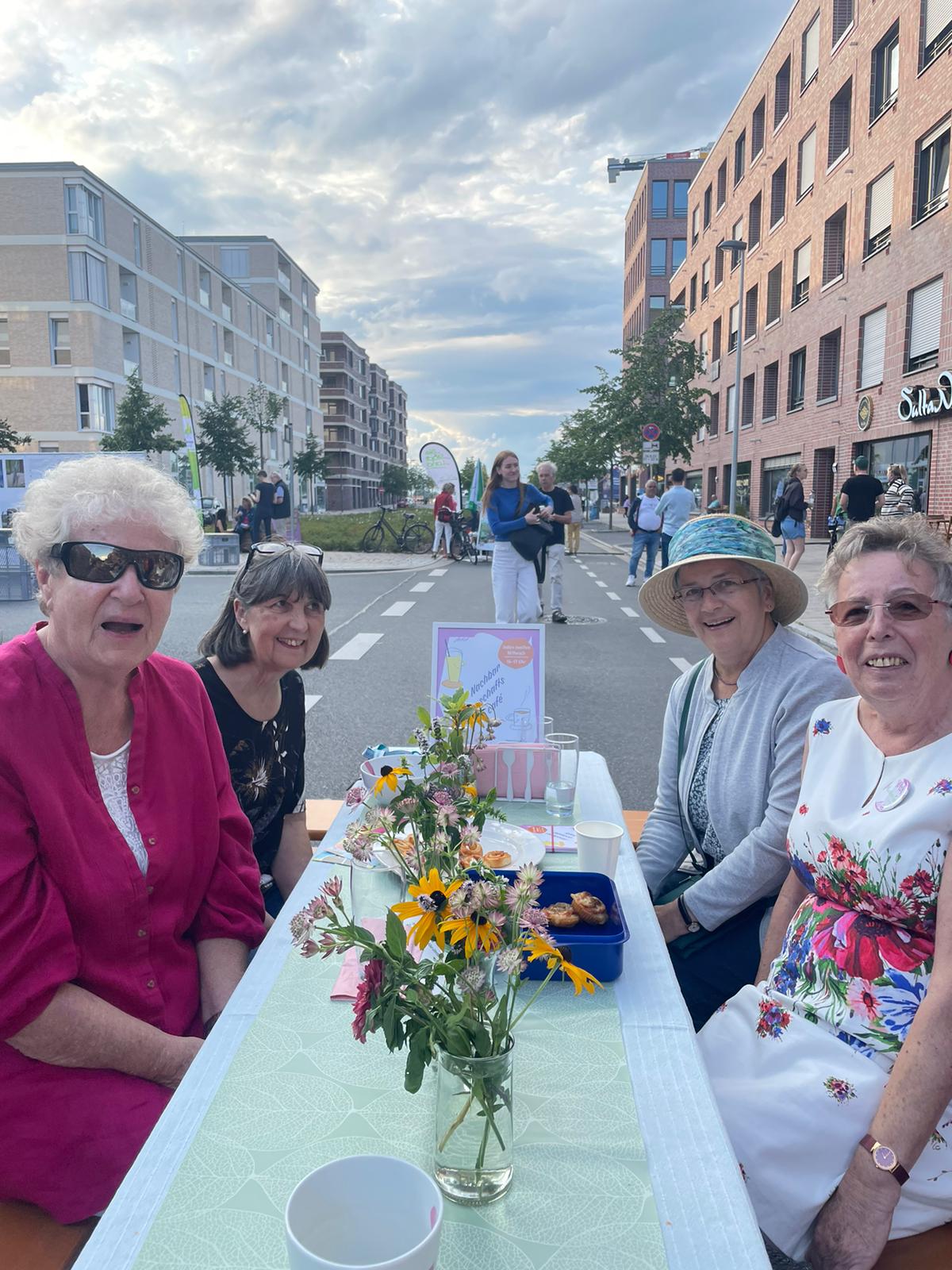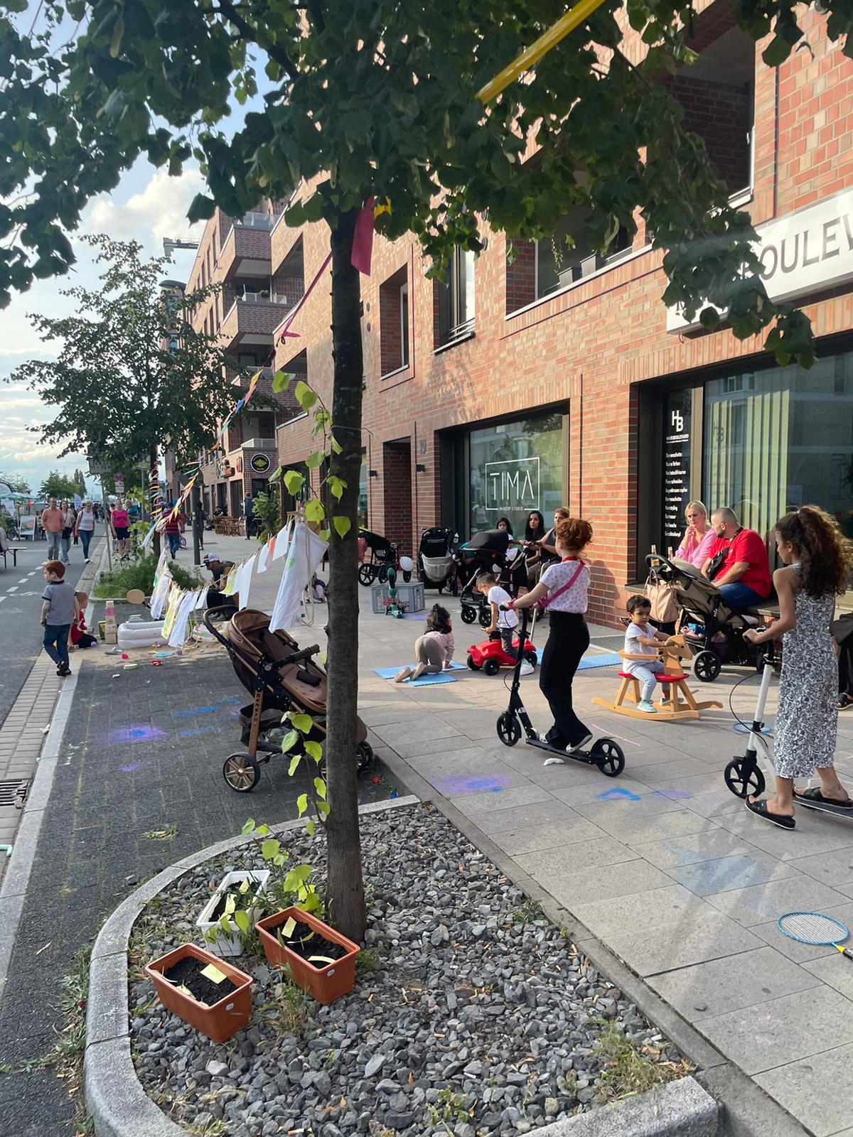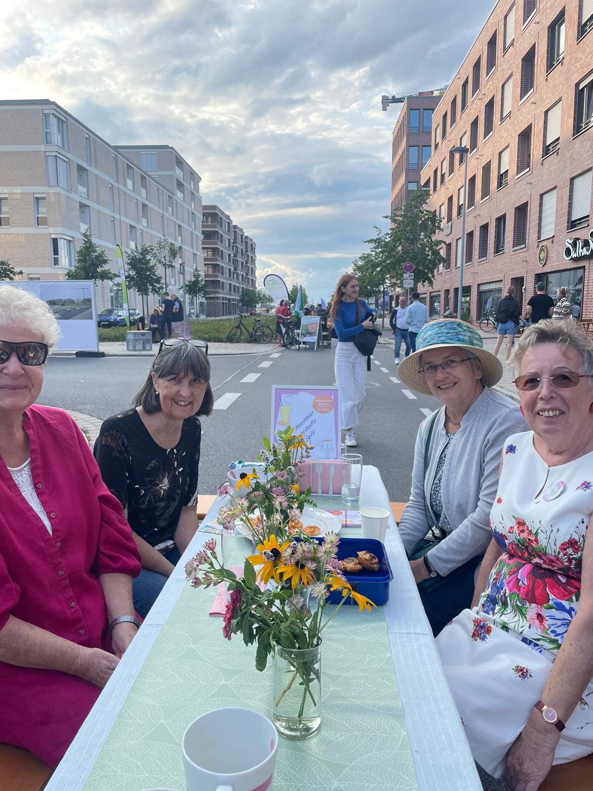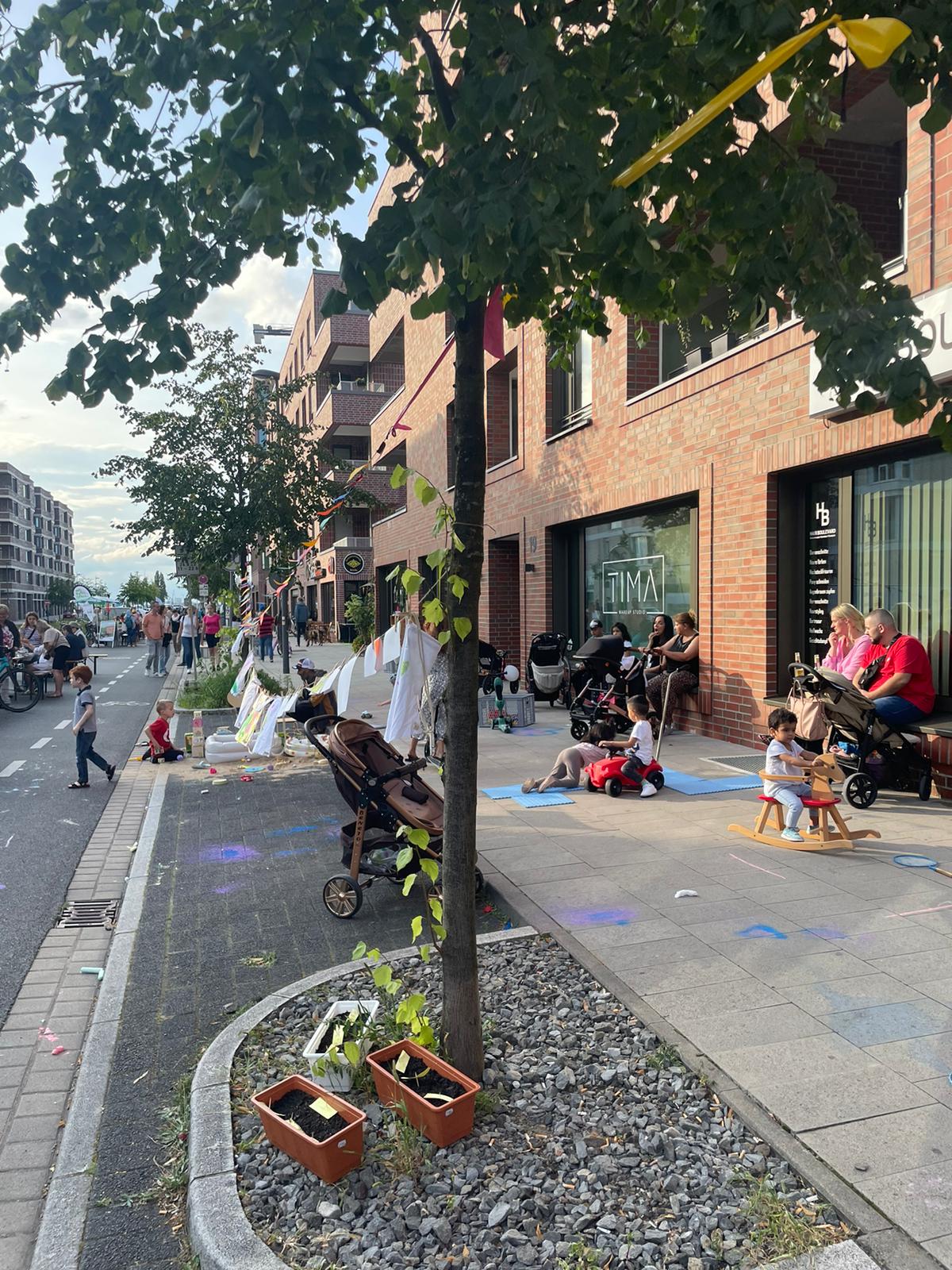 Die zahlreichen Tische wurden von den Nachbar:innen, Gruppen, Vereinen und Firmen bunt und vielfältig eingedeckt. Auf dem bunten Boulevard entstand so eine schöne und lebhafte Atmosphäre, geprägt von Gesprächen, Diskussionen und fröhlichem Miteinander.