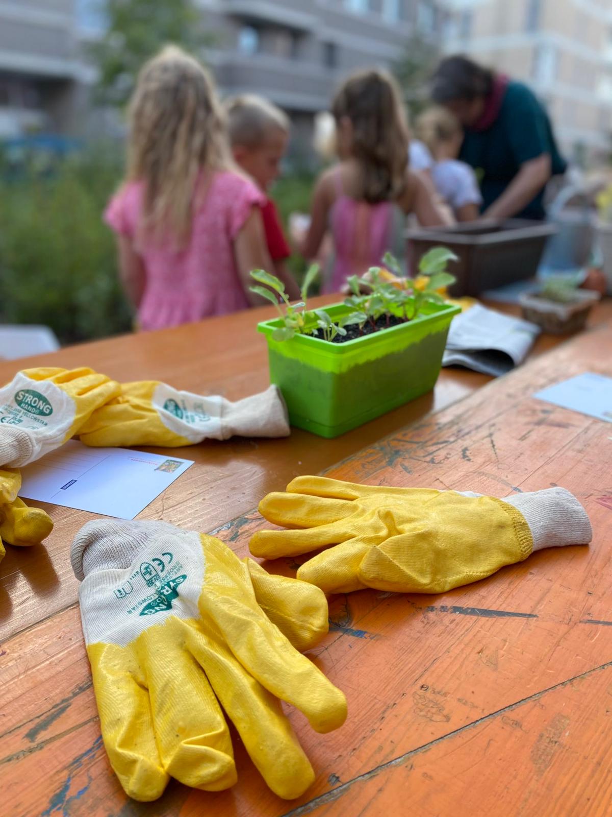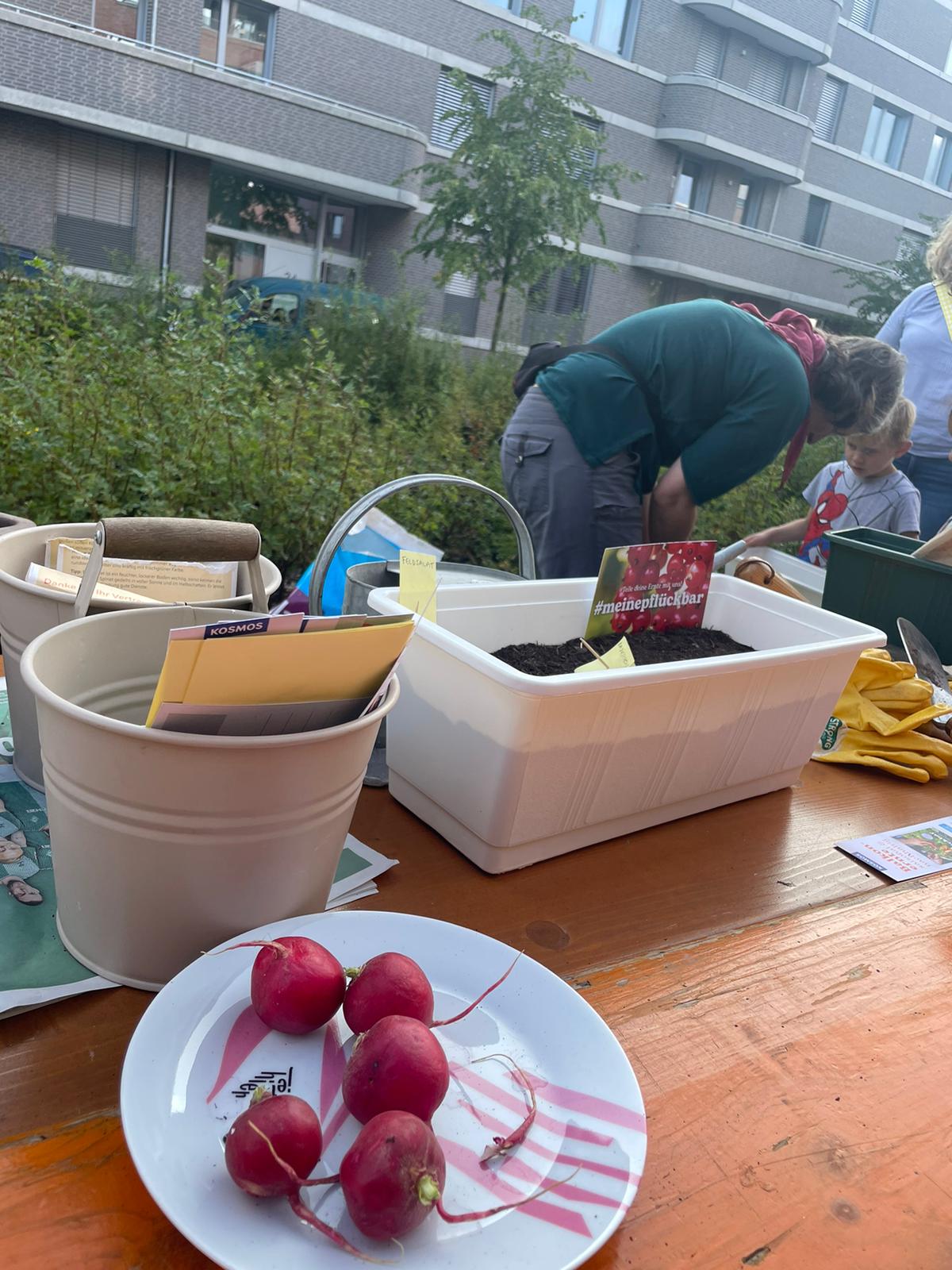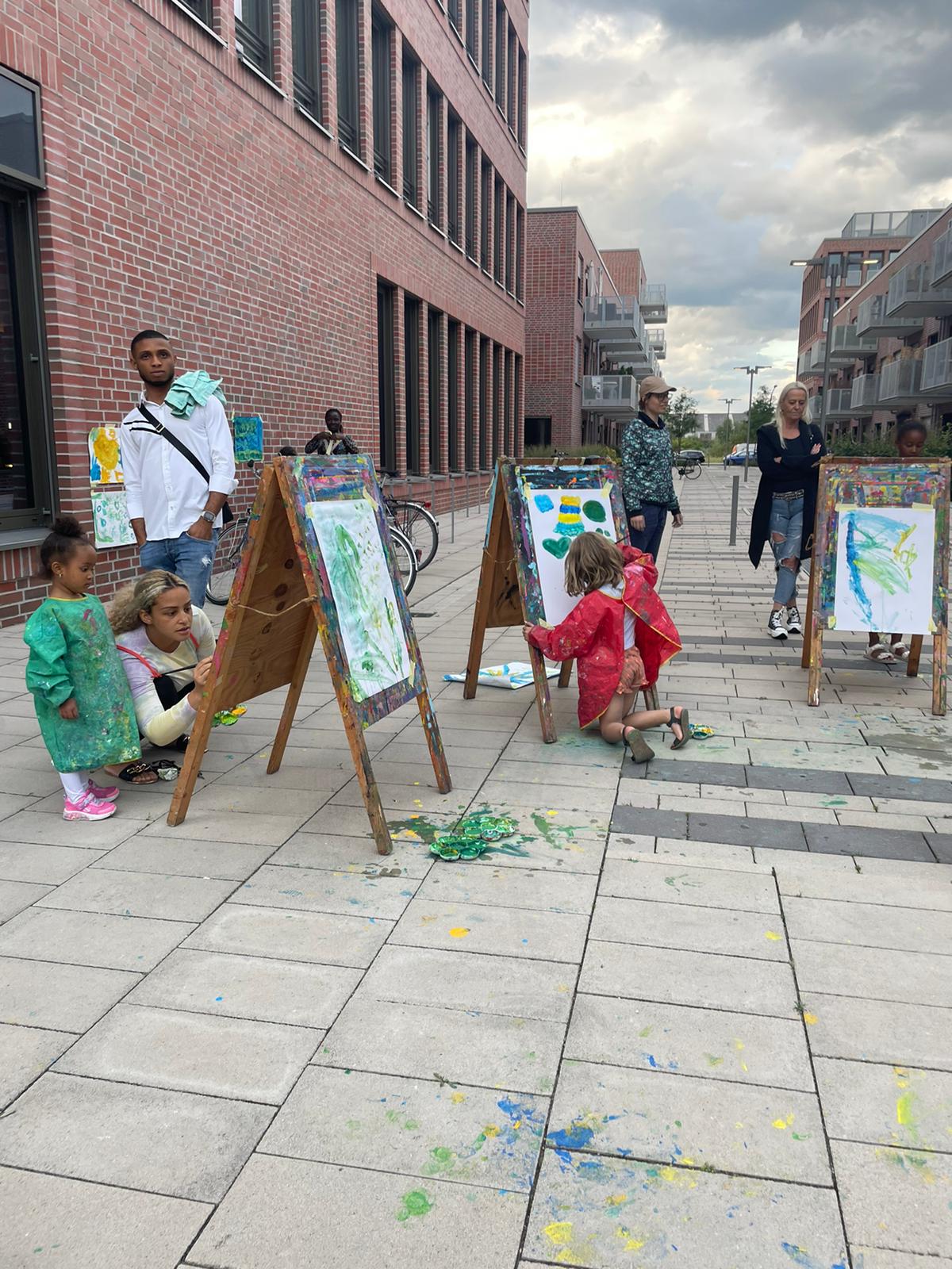 Die Veranstaltung stand ganz im Zeichen des gemeinschaftlichen Miteinanders und bot zahlreiche Möglichkeiten, die Überseestadt besser kennenzulernen. Die Themen „Grüne(re) Orte und Aufenthaltsqualität“ wurden in den Fokus gerückt. Viele Nachbar:innen wünschten sich mehr grüne Plätze mit hoher Aufenthaltsqualität. Diese Anliegen wurden durch Gespräche, Balkon-Pflanz-Aktionen und blühende Dekorationen auf den Tischen beleuchtet. Melanie Öhlenbach von Kistengrün leitete einen Workshop zum Thema „Balkone begrünen“, bei dem die Besucher:innen praktische Tipps für nachhaltiges Gärtnern erhielten. Eine Fotoausstellung von Nikolai Wolff zeigte Grün vs. Beton, Aufenthaltsqualität und Klima in der Überseestadt. Die Ausstellung von Nikolai Wolff wird nochmal vom 25. September bis 8. Oktober im Überseepark zu sehen sein. Das Mobile Atelier sorgte wieder für viel Spaß und Kreativität bei den Kids.