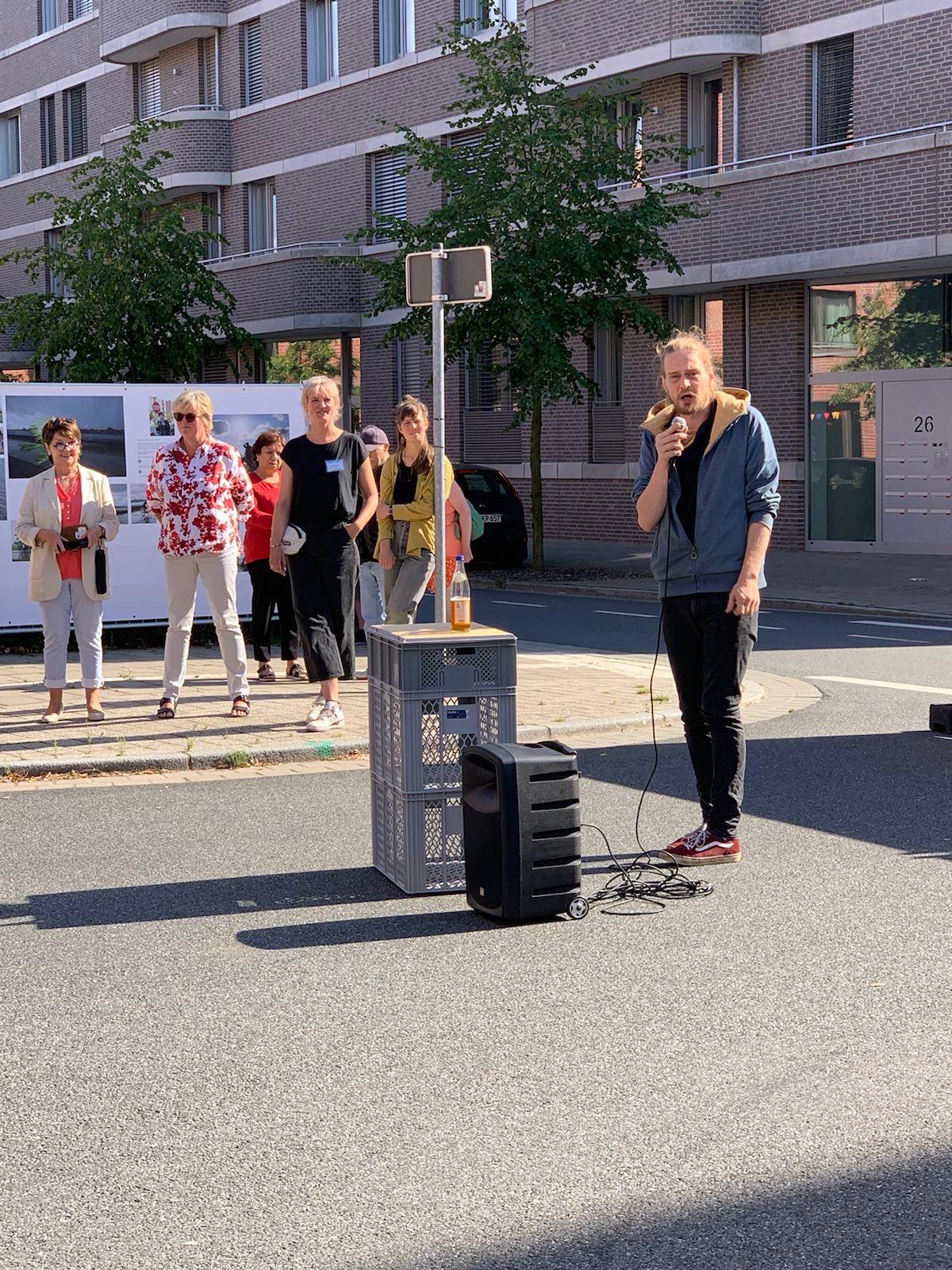 Poetry Slammer Simeon Buß performte „Was uns prägt“. Simeon Buß begleitete die Nachbarschaft bei zwei Begehungen in der Überseestadt, die im Vorfeld des Picknicks stattfanden. Eine „Florale Entdeckungstour“ und eine Begehung zu den Themen „Klimawandel und Klimaanpassungsstrategien“. Die Inhalte der Spaziergänge und die Perspektiven der Nachbarschaft bilden die Grundlage für diesen Text, der zum Nachdenken über Nachbarschaftsthemen anregt. Die Audio Datei wird demnächst hier veröffentlicht. Hier das PDF zum nachlesen: Was uns prägt