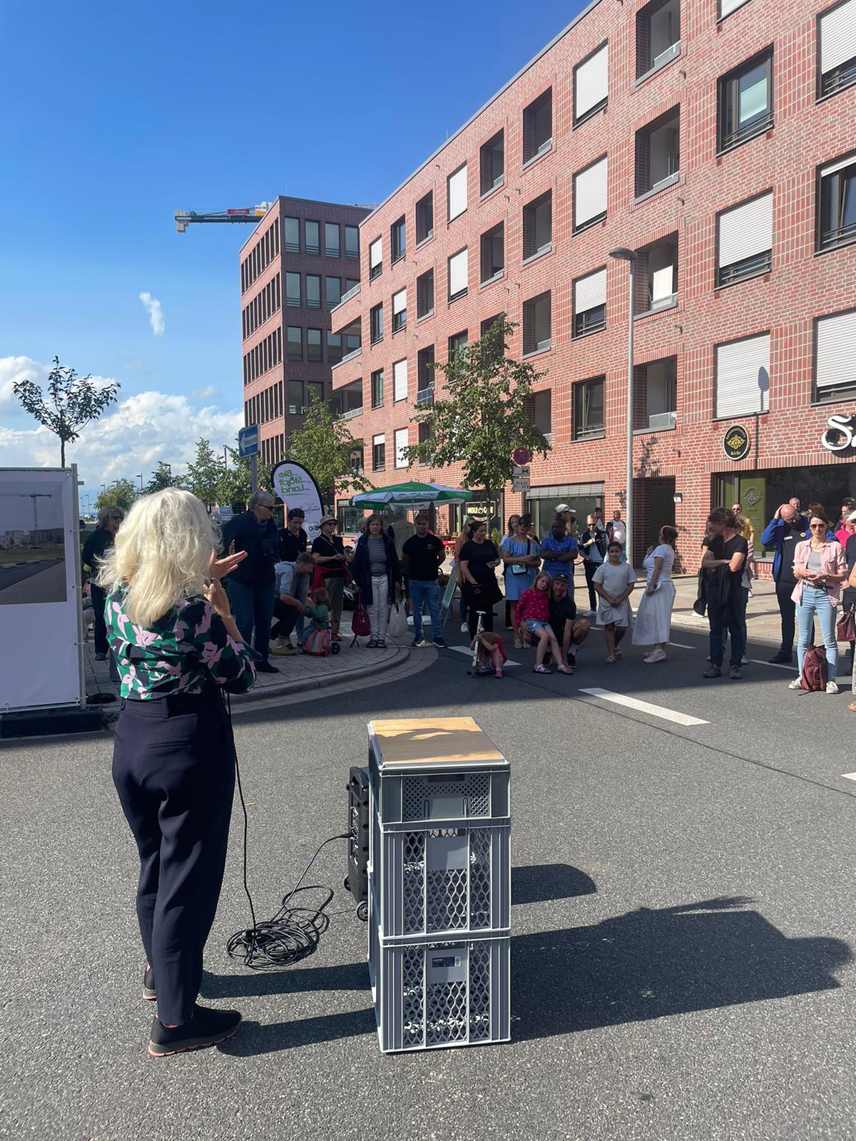 Besonders gefreut hat uns der Besuch von Dr. Kirsten Kappert-Gonther (Bündnis 90/Die Grünen). Sie ist Mitglied des deutschen Bundestages und eröffnete das Picknick sowie die Ausstellung von Nikolai Wolff. In ihrer Rede betonte sie die Bedeutung von Begegnungen, Umweltschutz und Teilhabe für die Gesundheitsförderung und das Glück der Menschen in ihren Lebensräumen. Dies seien Aspekte, die auch in der Stadtentwicklung vermehrt Berücksichtigung finden sollten. Die Lebensqualität der Bewohner:innen in den Quartieren trägt zur Gesundheitförderung bei. Das Straßenfest „Zu Tisch!“ sei ein sehr gutes Beispiel dafür, wie diese Aspekte umgesetzt werden können.