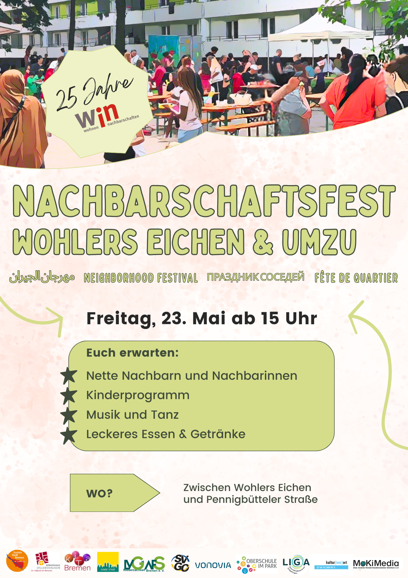 Gemeinsam feiern wir, was unsere Nachbarschaft ausmacht: Gute Zusammenarbeit, kreative Projekte, starke Netzwerke und eine engagierte Bewohnerschaft am Freitag, 23. Mai 2025 von 15:00 bis 18:00 Uhr zwischen Wohlers Eichen 55 und Pennigbütteler Straße 32.
