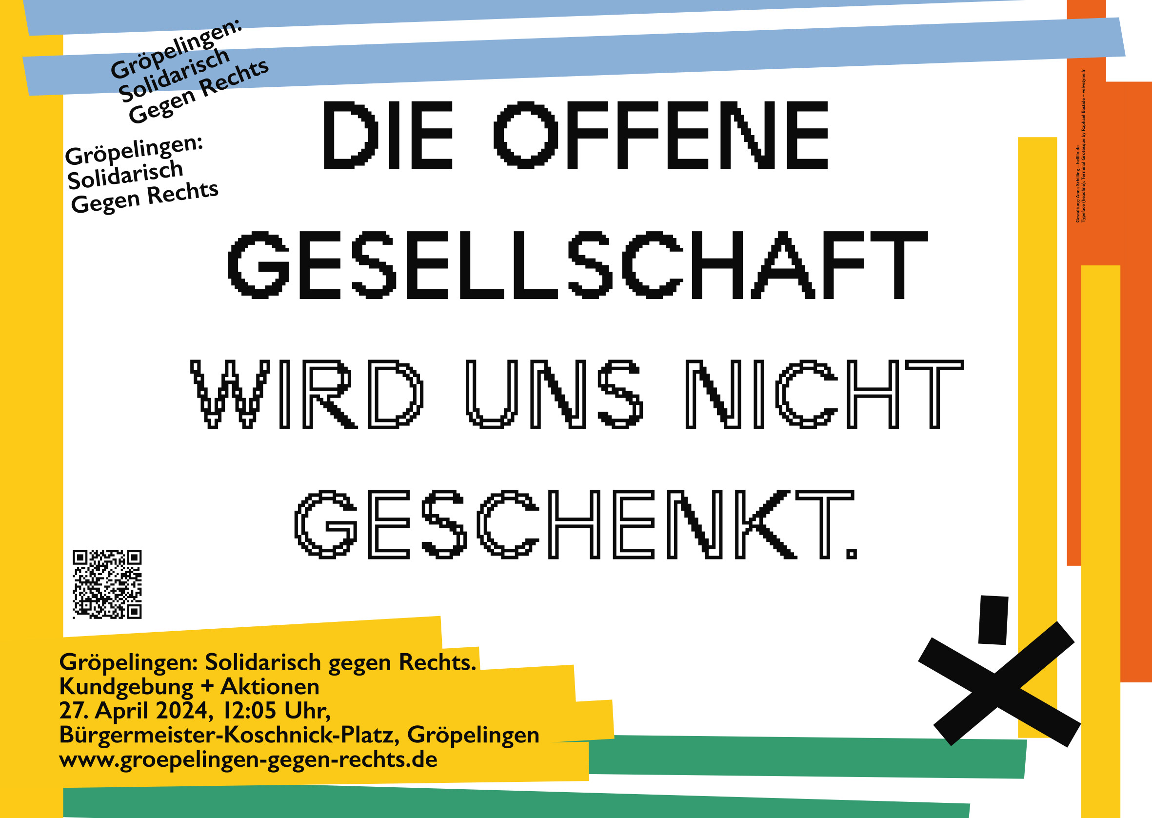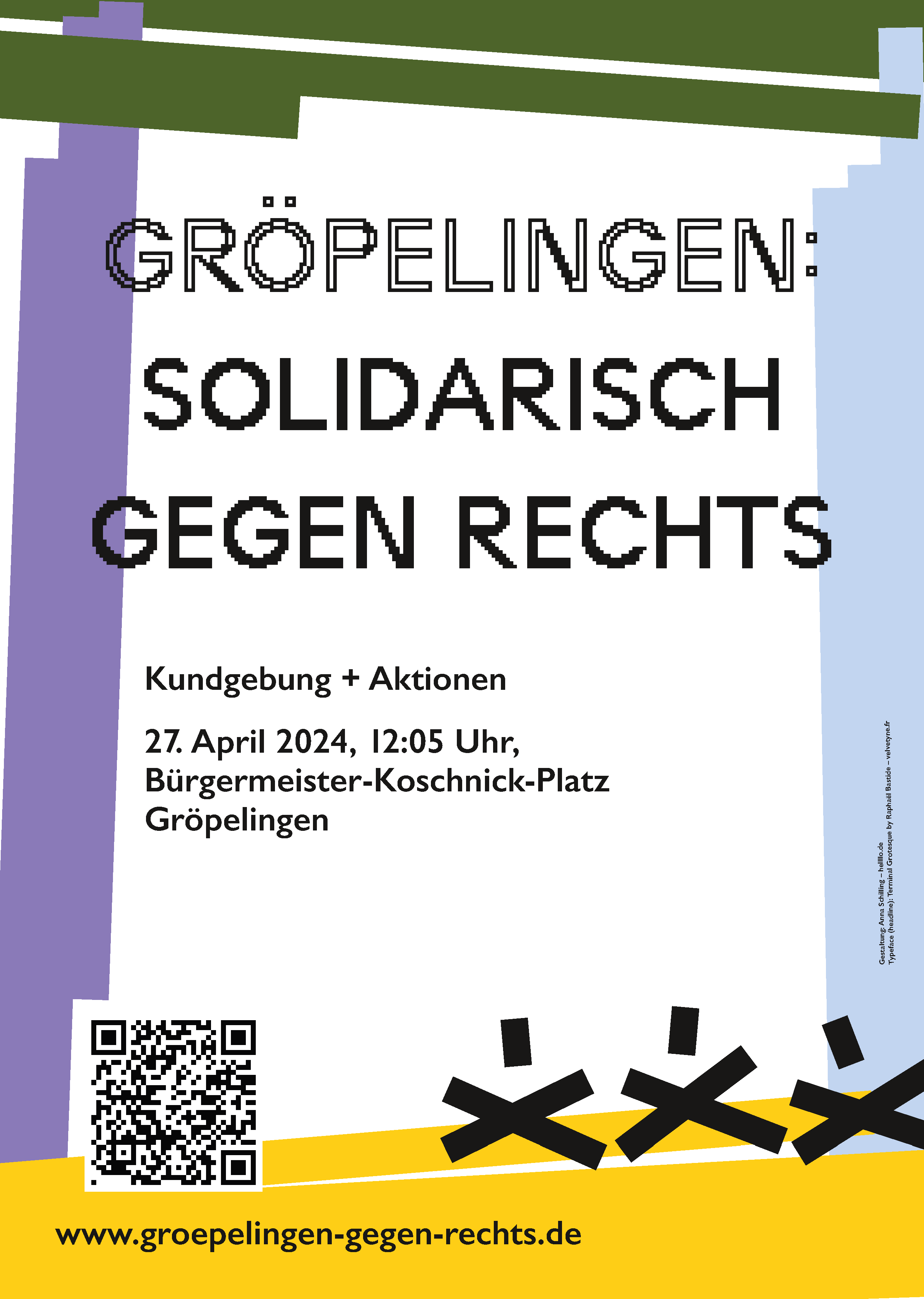Gröpelingen: Solidarisch gegen Rechts: 27. April, 12:05 Uhr, Bürgermeister-Koschnick-Platz Im Herzen Gröpelingens demonstrieren, vernetzen und diskutieren wir gegen Rechtsextremismus, Rechtspopulismus und rechte Gewalt. Kundgebung und Aktionen. Alle sind eingeladen! www.groepelingen-gegen-rechts.de Die Rechten betreiben die Spaltung der Gesellschaft Seit einigen Jahren…