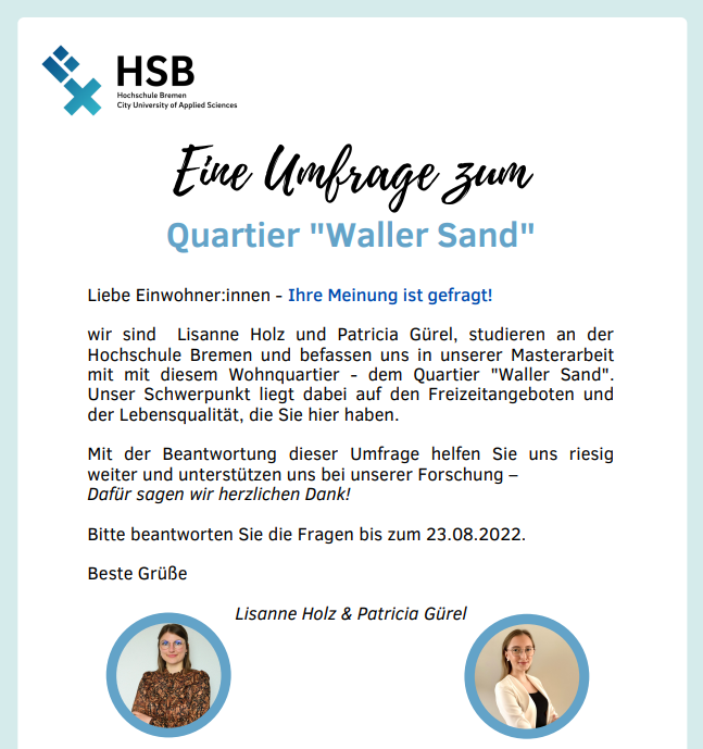 An diesem Tisch ist eure Meinung ganz besonders gefragt. Patricia Gürel und Lisanne Holz der Hochschule Bremen befassen sich im Rahmen ihrer Masterarbeit mit dem Quartier „Waller Sand“ (Rewe bis Waller Sand). Es wird erforscht, wie hoch die Lebensqualität im Quartier ist und welche Freizeitangebote zur Steigerung der Lebensqualität beitragen können. Bitte nehmt euch ein paar Minuten zur Beantwortung der Fragen Zeit und kommt am Tisch miteinander ins Gespräch.