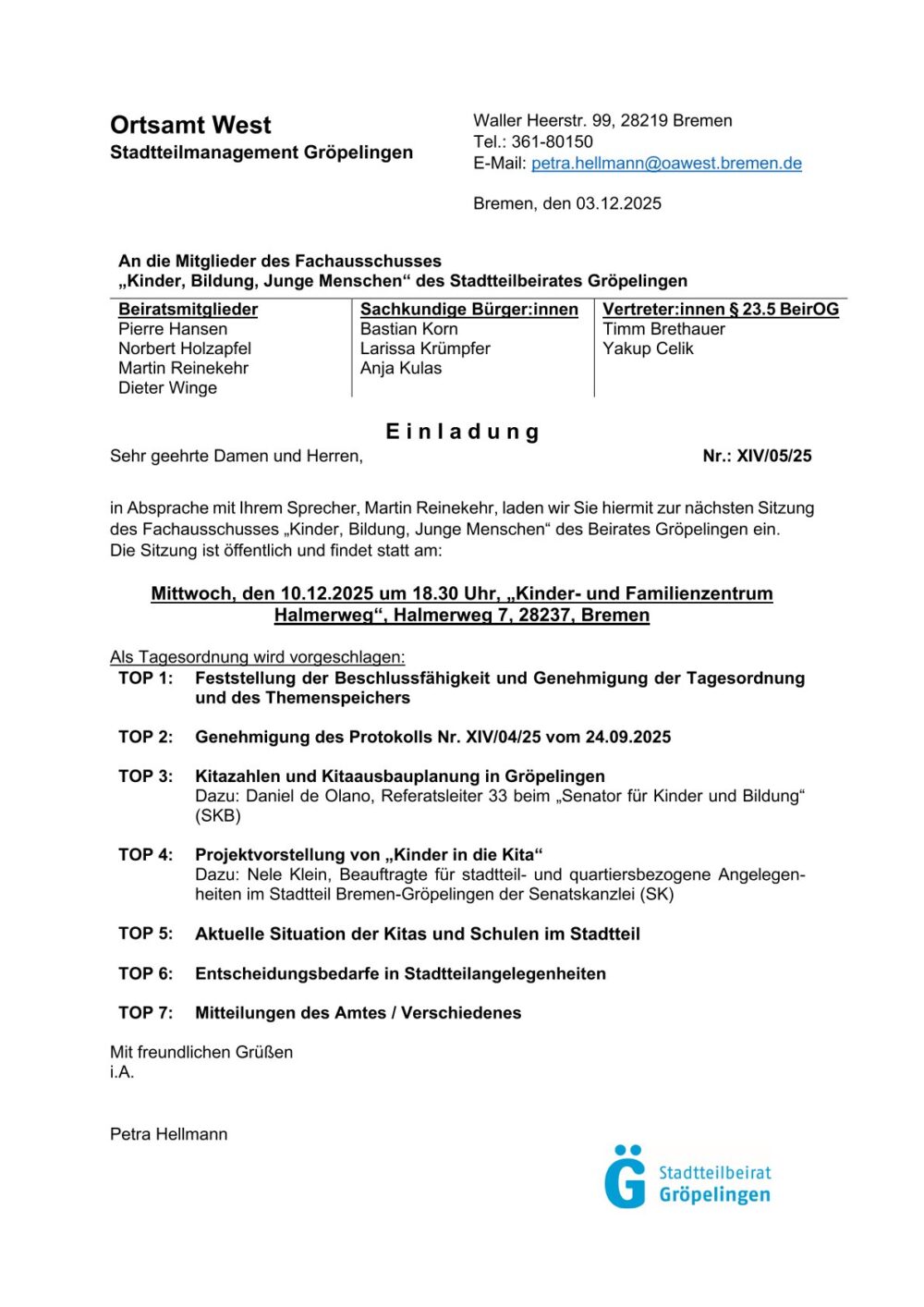 Einladung zur öffentlichen Sitzung des Fachausschusses „Kinder, Bildung, Junge Menschen“.  Am 10.12.2025 tagt der Fachausschuss des Gröpelinger Beirats ab 18:30 im Kinder- und Familienzentrum Halmerweg.