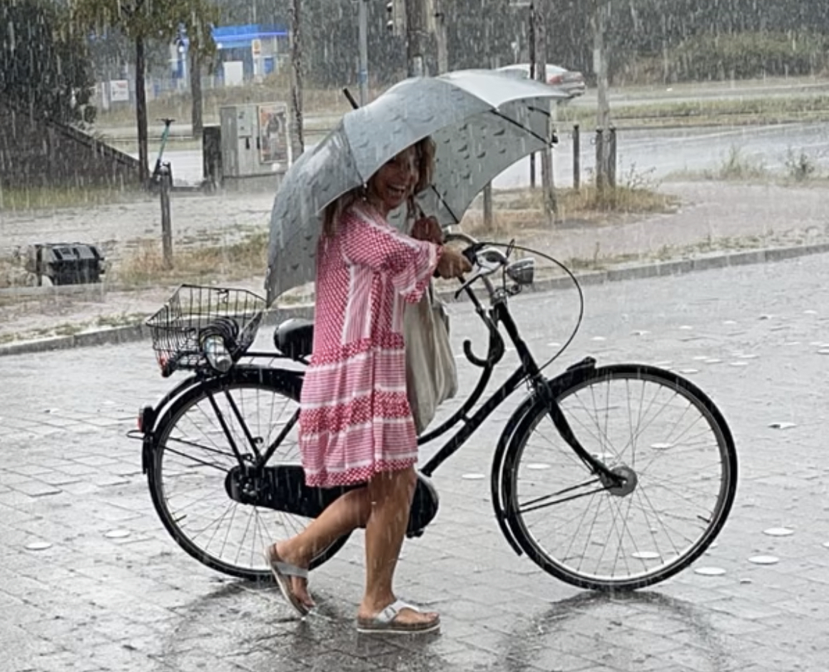 Eine Frau schiebt im Regen lachend ihr Fahrrad. Sie hält einen Regenschirm in der einen Hand, in der Anderen den Fahrradlenker.