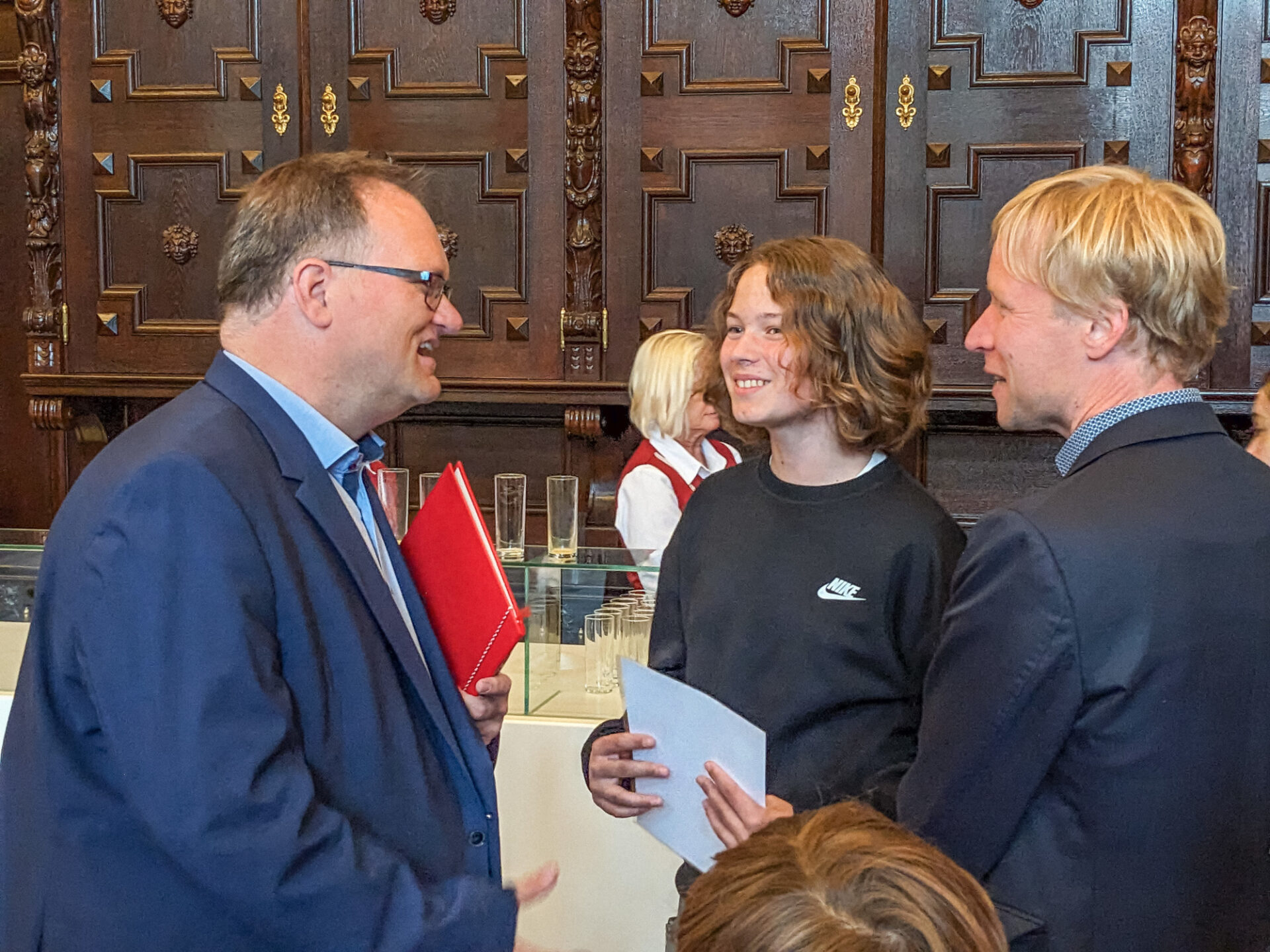 Ilja Wellmann ist nach Auflösung der Videowerkstatt Gröpelingen mittlerweile bei seiner Schüler:innen-Zeitung aktiv, sodass sich auch der Bremer Bürgermeister und Senator für Finanzen, Björn Fecker, nicht nehmen ließ, dem Nachwuchsfilmemacher noch einmal persönlich zu gratulieren.