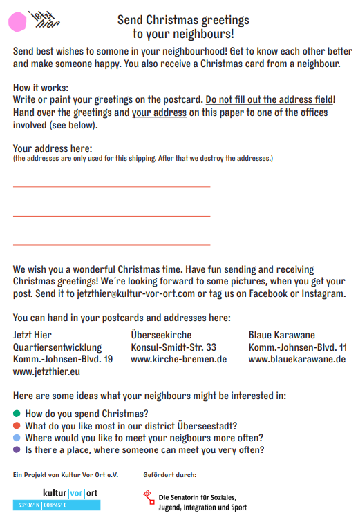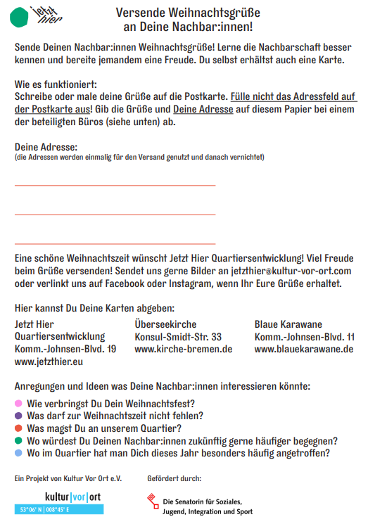 Schreibe oder male deine Grüße auf die Postkarte. Die leere Postkarte sowie den Flyer mit der Anleitung finden alle Nachba:innen der Überseestadt (bis 10. Dezember) in ihren Briefkästen. Darüber hinaus liegen die Karten bei teilnehmenden Büros (siehe unten) aus.