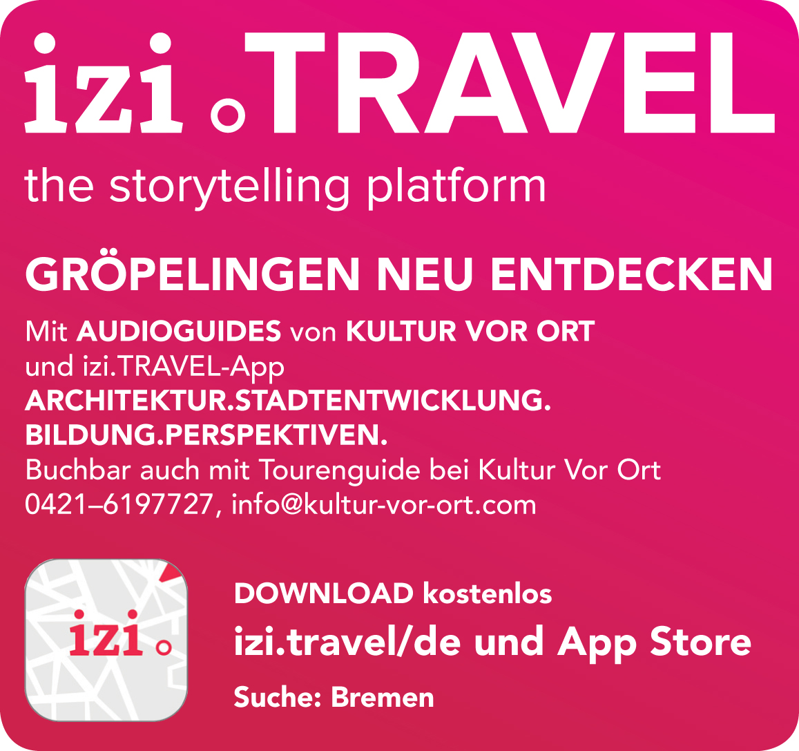 Mit dem digitalen Rundgang „Bauten und Ideen. Baukultur in Bremen Gröpelingen“ auf der Website izi.TRAVEL.de und der dazugehörigen App wandelt man ab sofort auf den baukulturellen Spuren Gröpelingens und taucht ein in Geschichten der Stadtentwicklung.  Durch das internationale Quartier führt ein weiterer Rundgang unter dem Titel „In 80 Minuten um die Welt. Rundgang durch den Stadtteil der Hundert Sprachen. Bremen Gröpelingen.“