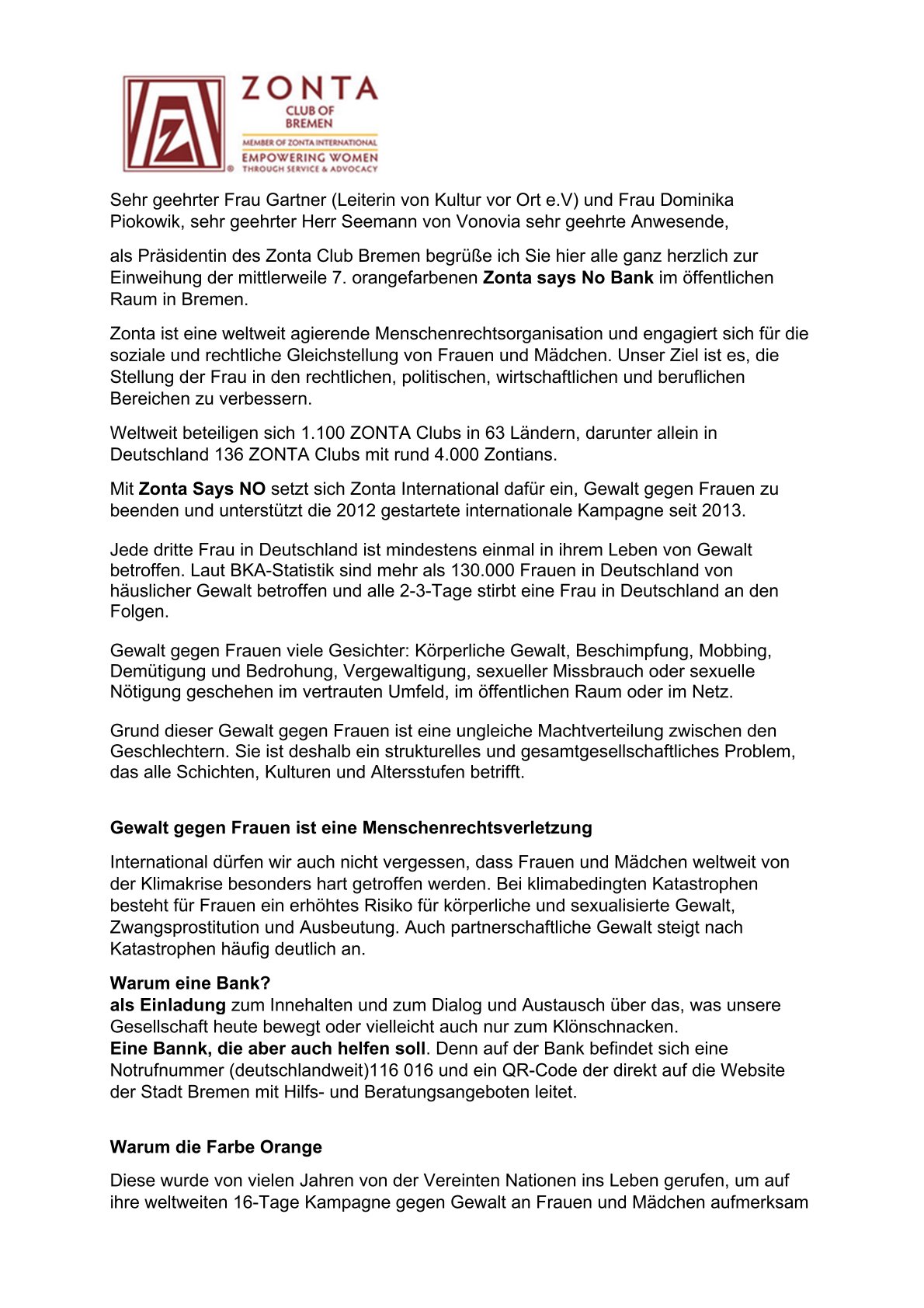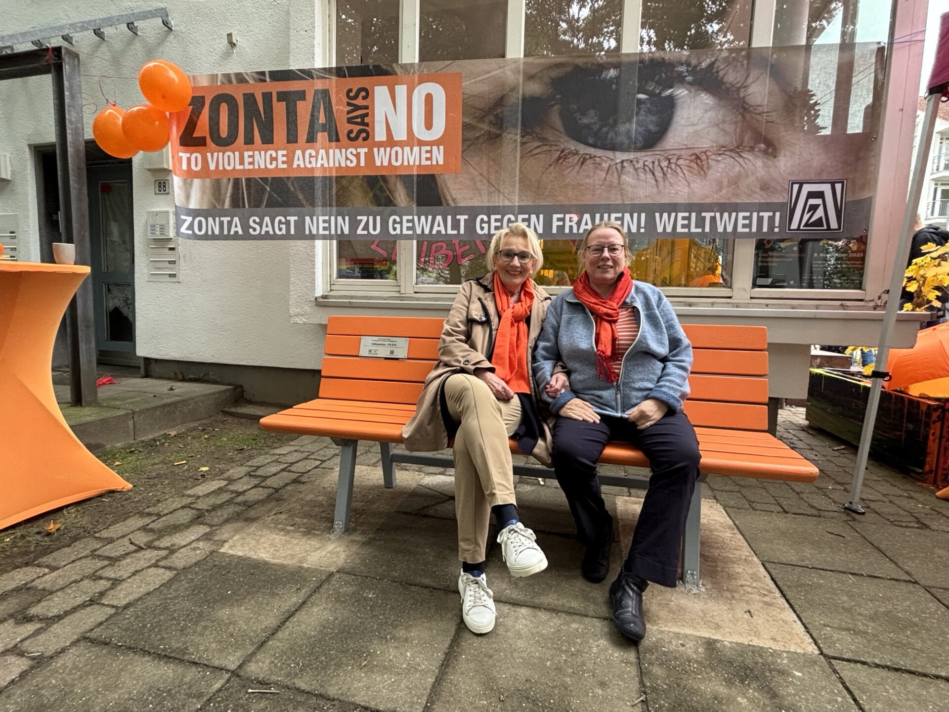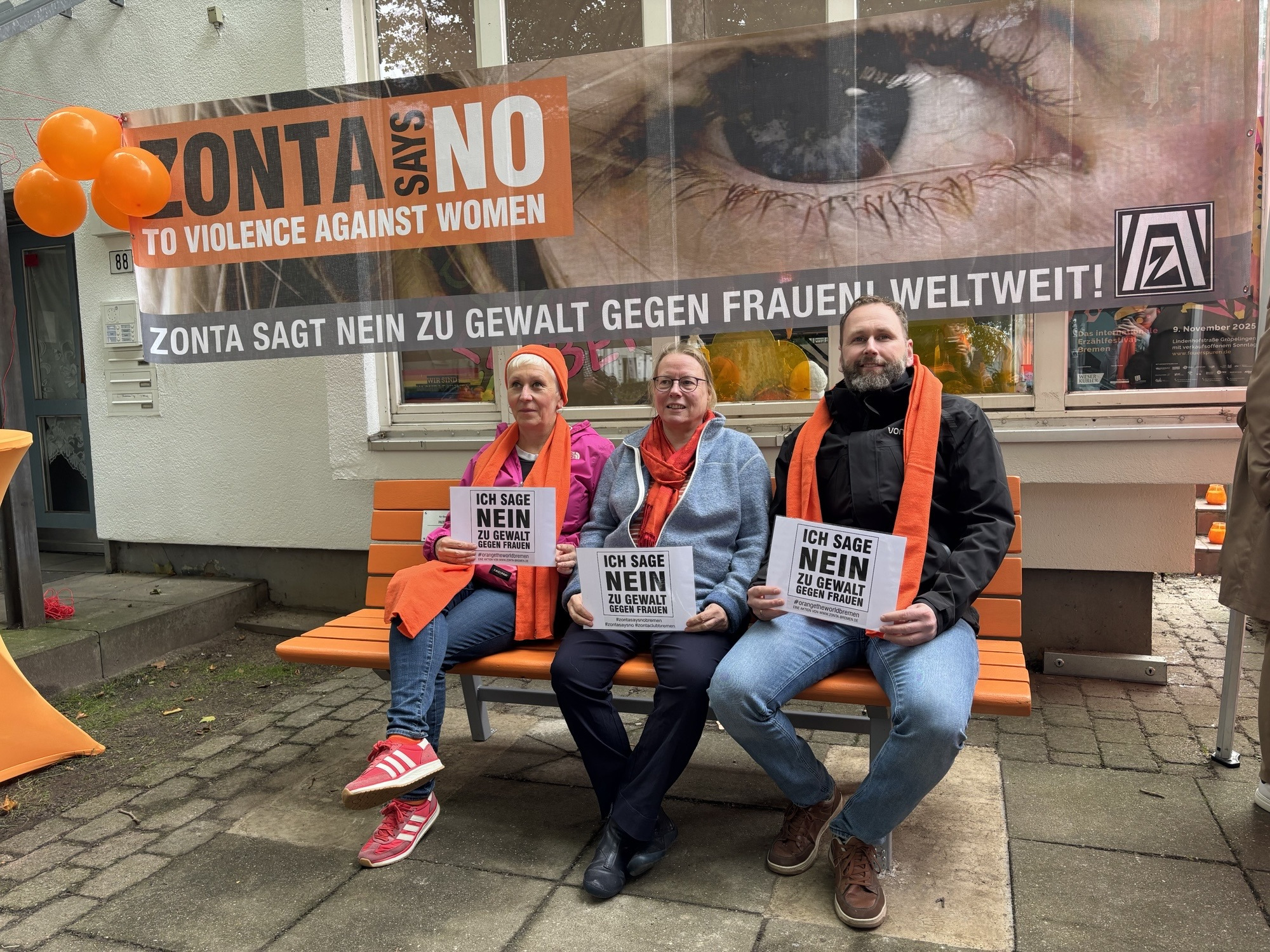 Die Einweihung fand in Kooperation mit Kultur Vor Ort e. V. und der VONOVIA statt und wurde von zahlreichen Nachbar:innen und Vereinsmitgliedern begleitet. Die orangefarbene Bank ist Teil der internationalen Kampagne „ZONTA Says NO – ORANGE THE WORLD“, die weltweit auf geschlechtsspezifische Gewalt aufmerksam macht.