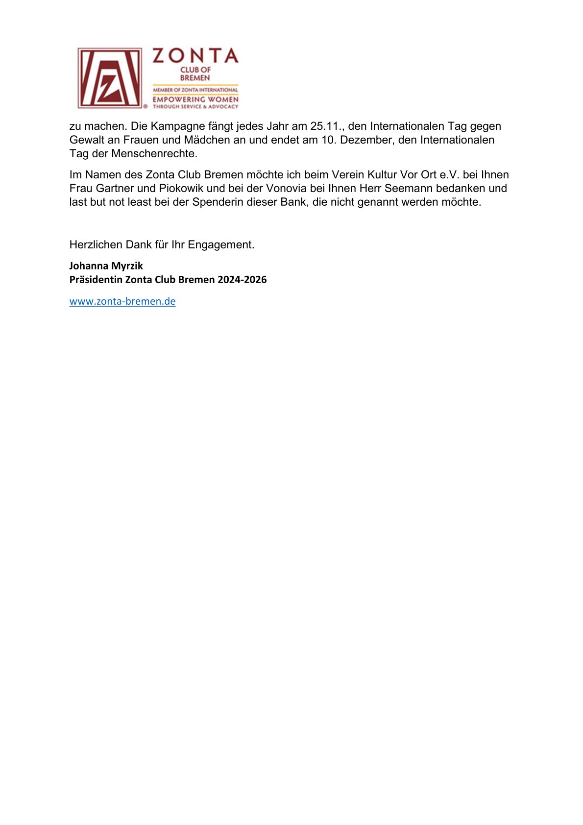 „Mit jeder Bank schaffen wir mehr Sichtbarkeit für ein Thema, das oft im Verborgenen bleibt. Wir wollen Mut machen, Hilfe anbieten und ein Zeichen der Solidarität setzen“, so Prof. Dr. Johanna Myrzik, Präsidentin des Zonta Clubs Bremen.